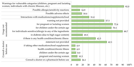Labels of 37 products (42.5%) stated that the product is not recommended if there is a medical condition/chronic disease. The most frequently referred disease was diabetes (17 out of 37, 46.0%), and warnings were related to the high sugar content of the product. However, as many as 50 products (57.5%) did not present such warnings/precautions, although numerous herbal ingredients of these supplements require warnings related to restrictions in their usage. A warning related to interactions with other supplements/foods/drugs was claimed for 27 products (31.0%), while possible side effects were notified on 16 (18.4%), and allergic reactions (hypersensitivity) on 13 (14.9%).