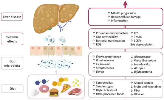 Diet directly influences microbial composition, leading to an increase in pro-inflammatory bacteria and a decrease in beneficial microbes. This imbalance is reflected systemically by enhanced intestinal permeability and elevated levels of inflammatory mediators, which contribute to the progression of liver disease.