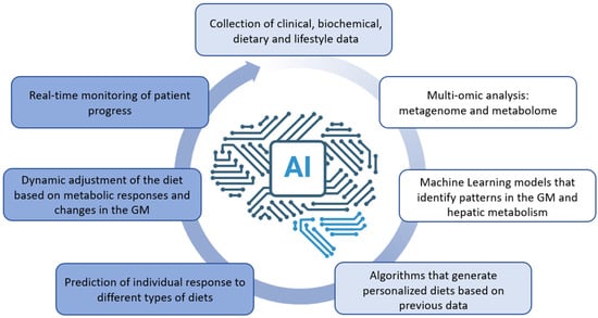 AI is being investigated in MASLD to develop reproducible, quantitative, and automated methods to enhance patient stratification and discover new biomarkers [18]. Different applications of AI and machine learning algorithms in MASLD, particularly in analyzing electronic health records, digital pathology, and imaging data, are being developed to support diagnosis, risk assessment, and treatment planning [156,157]. Furthermore, microbiota-based ML approaches are emerging as promising tools for disease classification and personalized therapy selection [147]. A key strength of AI-driven nutrition programs lies in their capacity to integrate multi-omics data—such as metagenomics, metabolomics, and transcriptomics—using models like deep learning and random forests. This enables the modeling of dynamic interactions between diet, gut microbiota, and host metabolism. AI systems can process large volumes of individualized health data to predict responses to specific nutrients and dietary patterns. For instance, predictive algorithms can estimate the impact of high-fiber diets on the abundance of beneficial microbes such as Akkermansia muciniphila and Faecalibacterium prausnitzii. These models can also account for genetic predisposition, metabolic flexibility, and behavioral adherence, allowing for highly tailored dietary interventions (see Figure 2).
