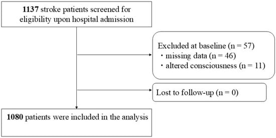 Over the study period, 1137 stroke patients were newly admitted to the wards. Of these, 46 patients with incomplete data and 11 with altered consciousness were excluded from the analysis. Following the application of exclusion criteria, a total of 1080 patients were included in the final analysis (Figure 1).