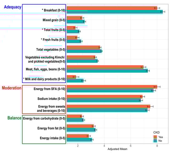 3.4. Healthy Dietary Patterns According to the Presence of CKD