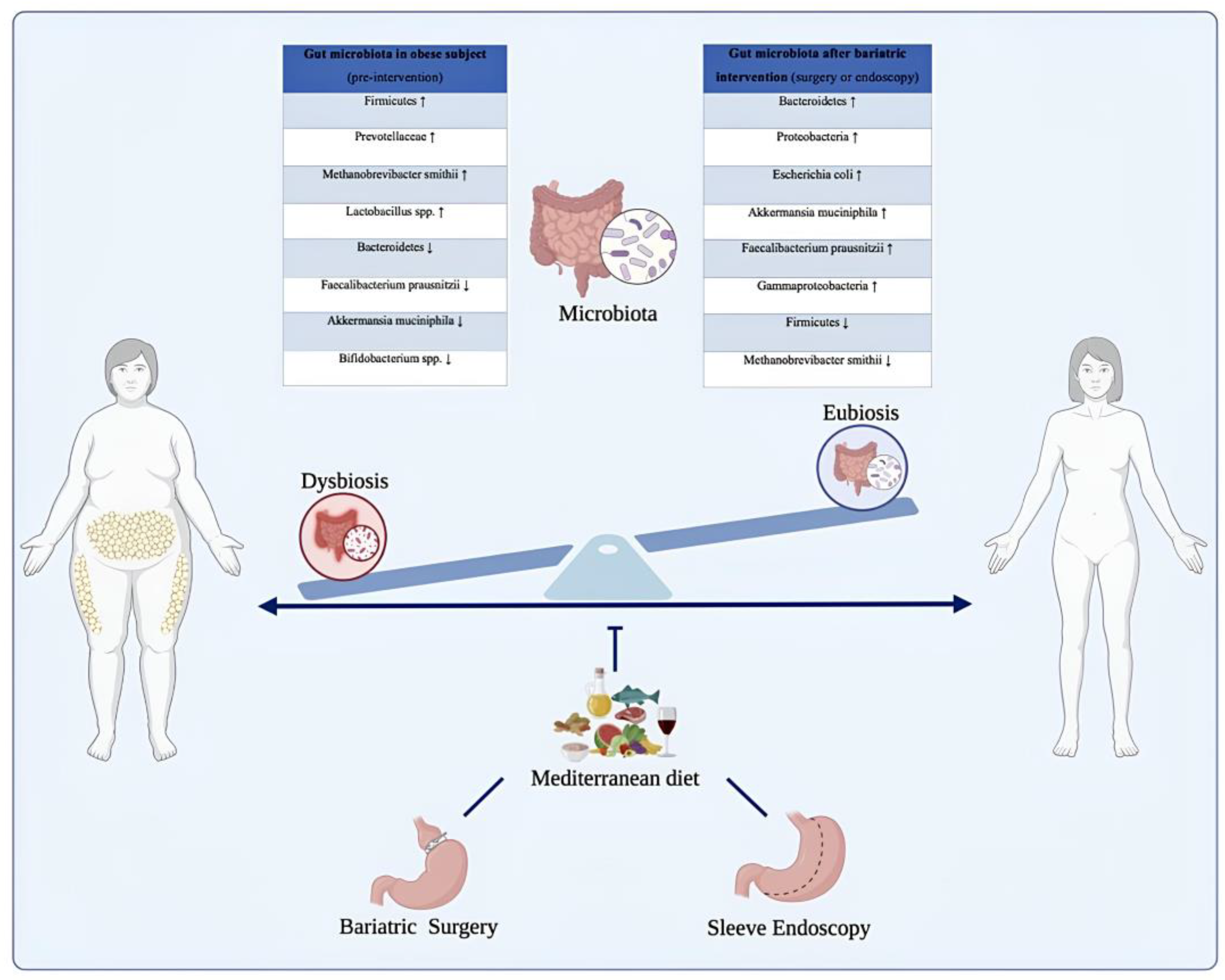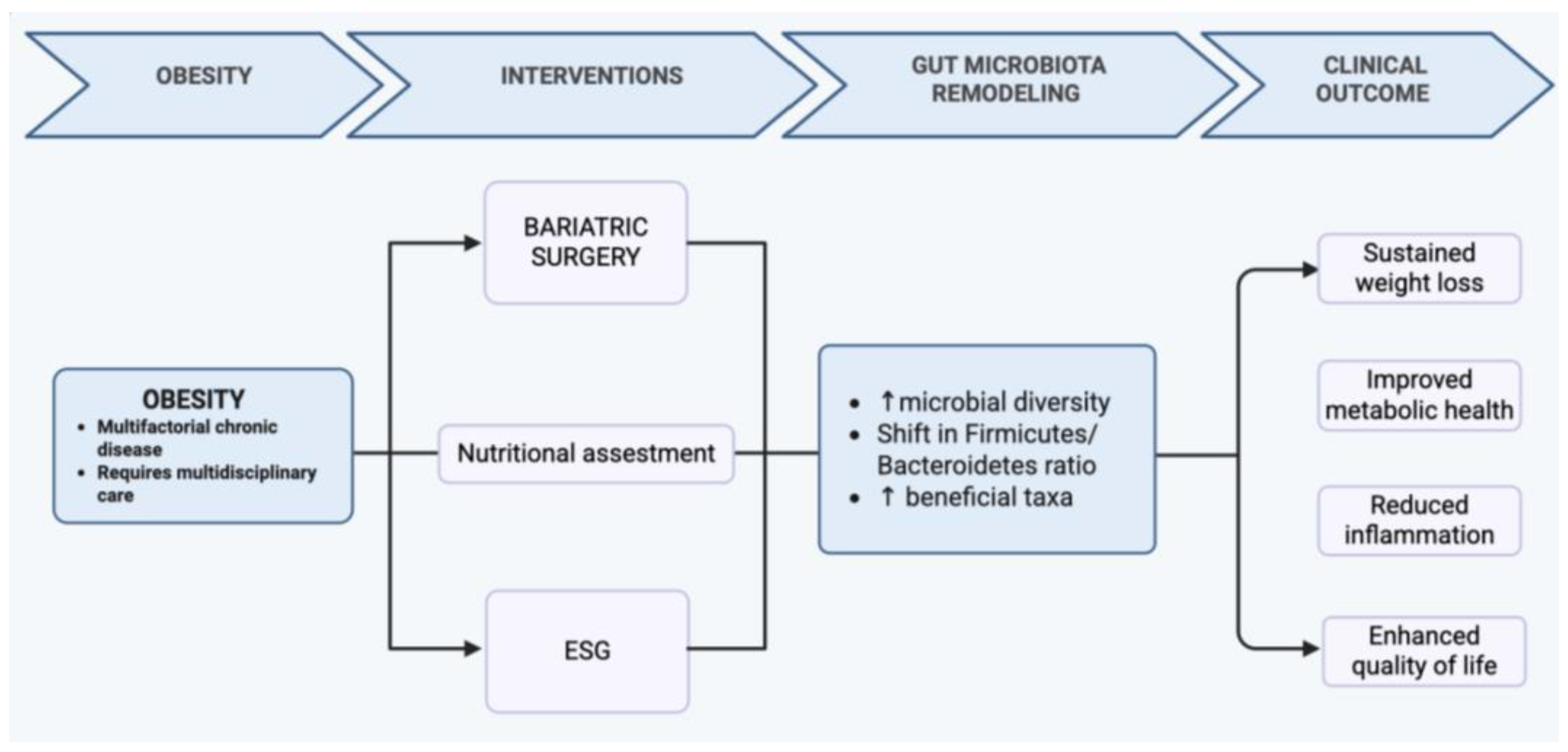 - Voermans, B.; Gerdes, V.; Nieuwdorp, M. Gut microbiota alterations and their role in the pathophysiology of obesity following bariatric surgery. Expert Rev. Endocrinol. Metab. 2025, 20, 291–305. [Google Scholar] [CrossRef] [PubMed]