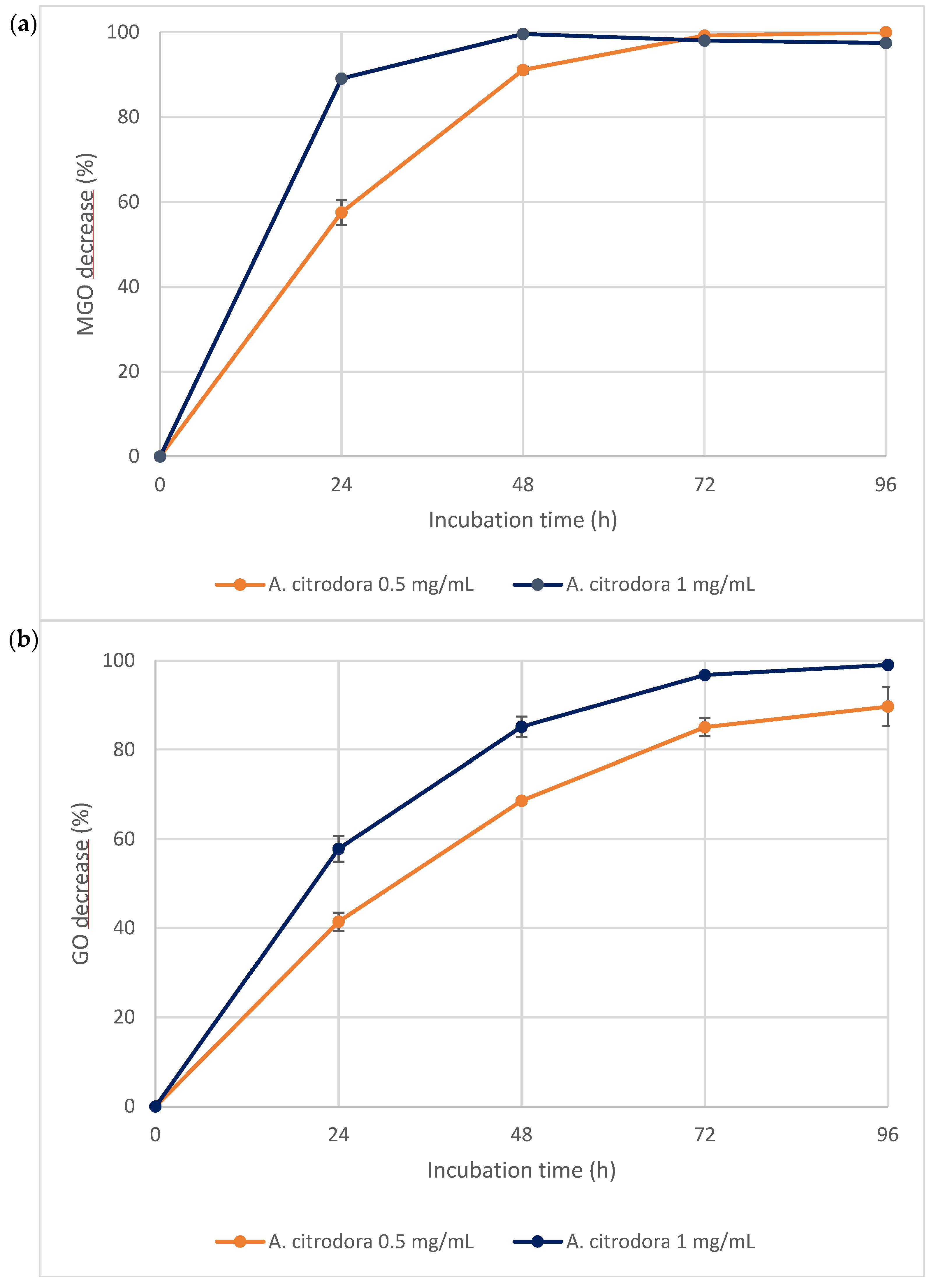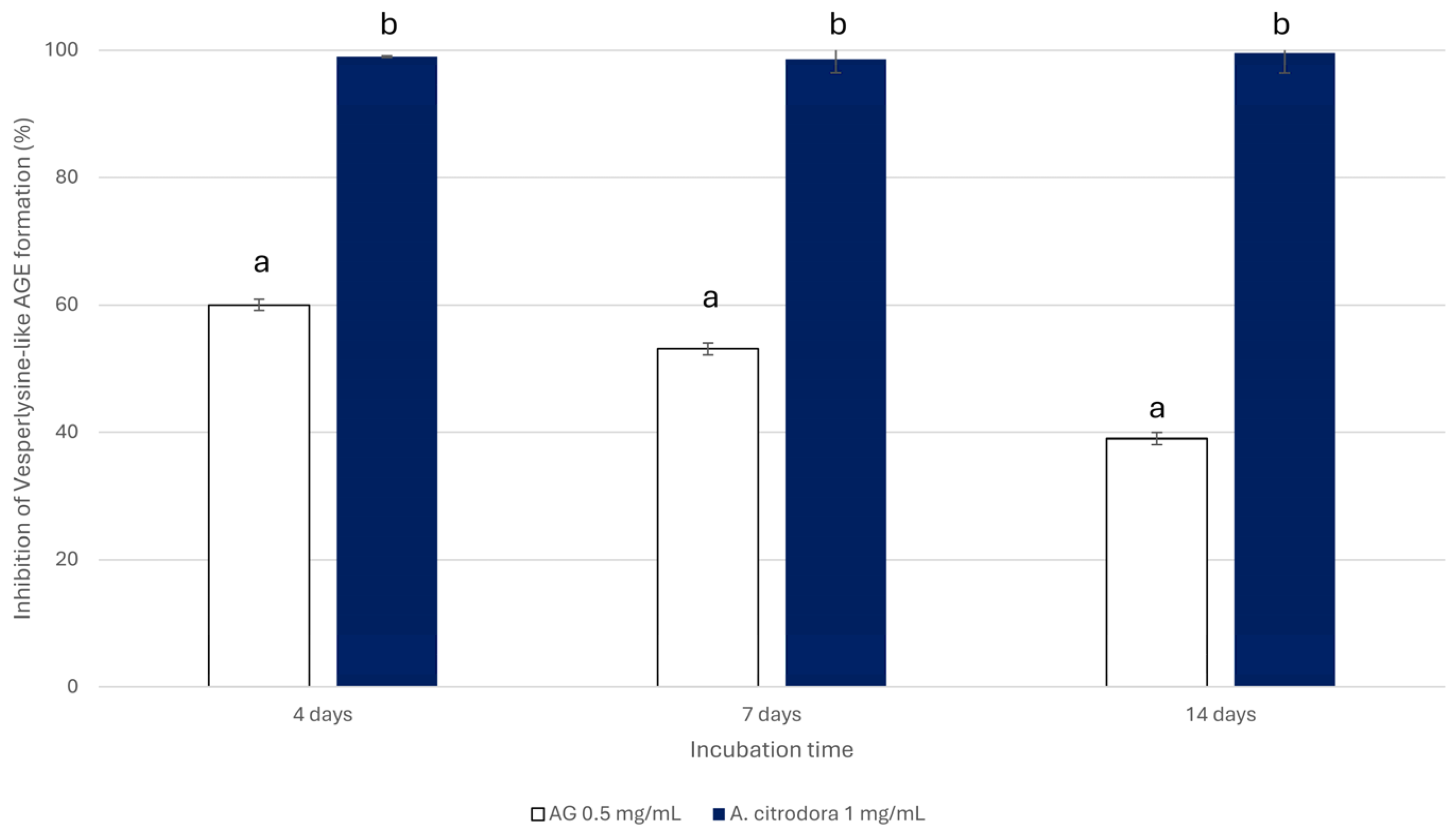 3.3.2. Anti-Glycative Properties of the A. citrodora Extract Bioaccessible Fraction