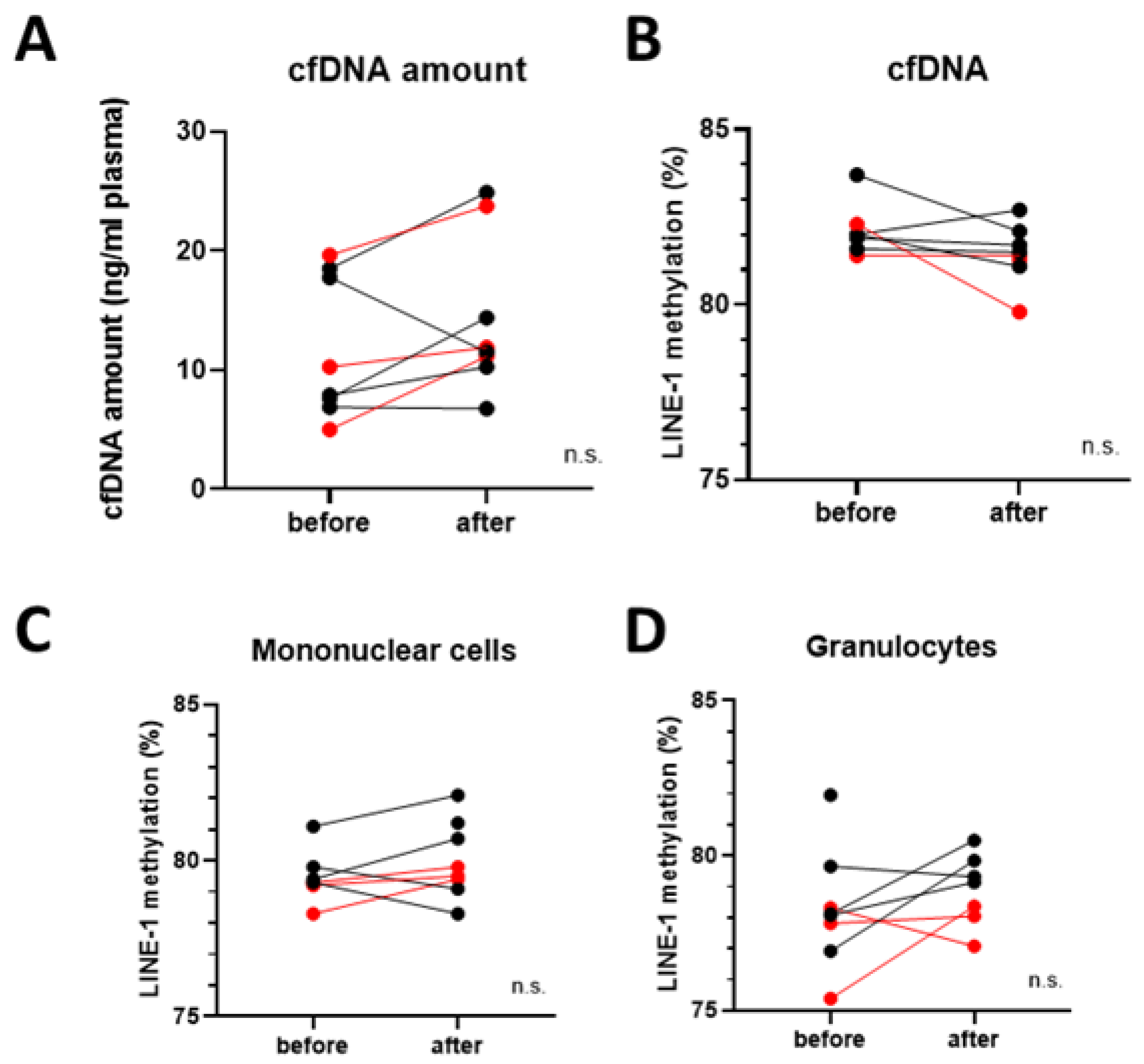 3.4. Global DNA Methylation in cfDNA and Blood Cells
