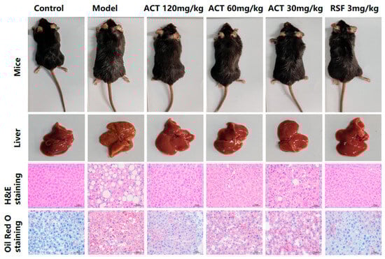 Macroscopic evaluation of liver samples as revealed in Figure 3 revealed that the control group showed typical reddish-brown coloration, soft texture, and sharp edges. In comparison, the model group was a pale-yellow discoloration with distinct yellow spots, severely altered texture, and blunt and rounded edges. After the treatment of ACT (30, 60 and 120 mg/kg) and RSF, the color and texture of the liver of mice were improved to varying degrees (see Supplementary Figures S1 and S2 for details).
