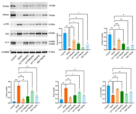 We sought to investigate the mechanism by which ACT enhances mitochondrial autophagy and ameliorates HFHS diet-induced lipid metabolism dysregulation through modulation of expression levels of PINK1, Parkin, LC3, p62, and p-p62. As shown in Figure 6, relative to the control group, the model group had significantly lower levels of PINK1, Parkin, and LC3II (p < 0.01) and higher levels of p62 and p-p62 (p < 0.01) in the liver. Compared to the model group, ACT treatment significantly increased PINK1, Parkin, and LC3II expression and decreased p62 and p-p62 expression (p < 0.05, Supplementary Table S8 and Figure S6). This indicates that ACT attenuates hepatic lipid deposition by activating the PINK1/Parkin signaling pathway to promote mitophagy.
