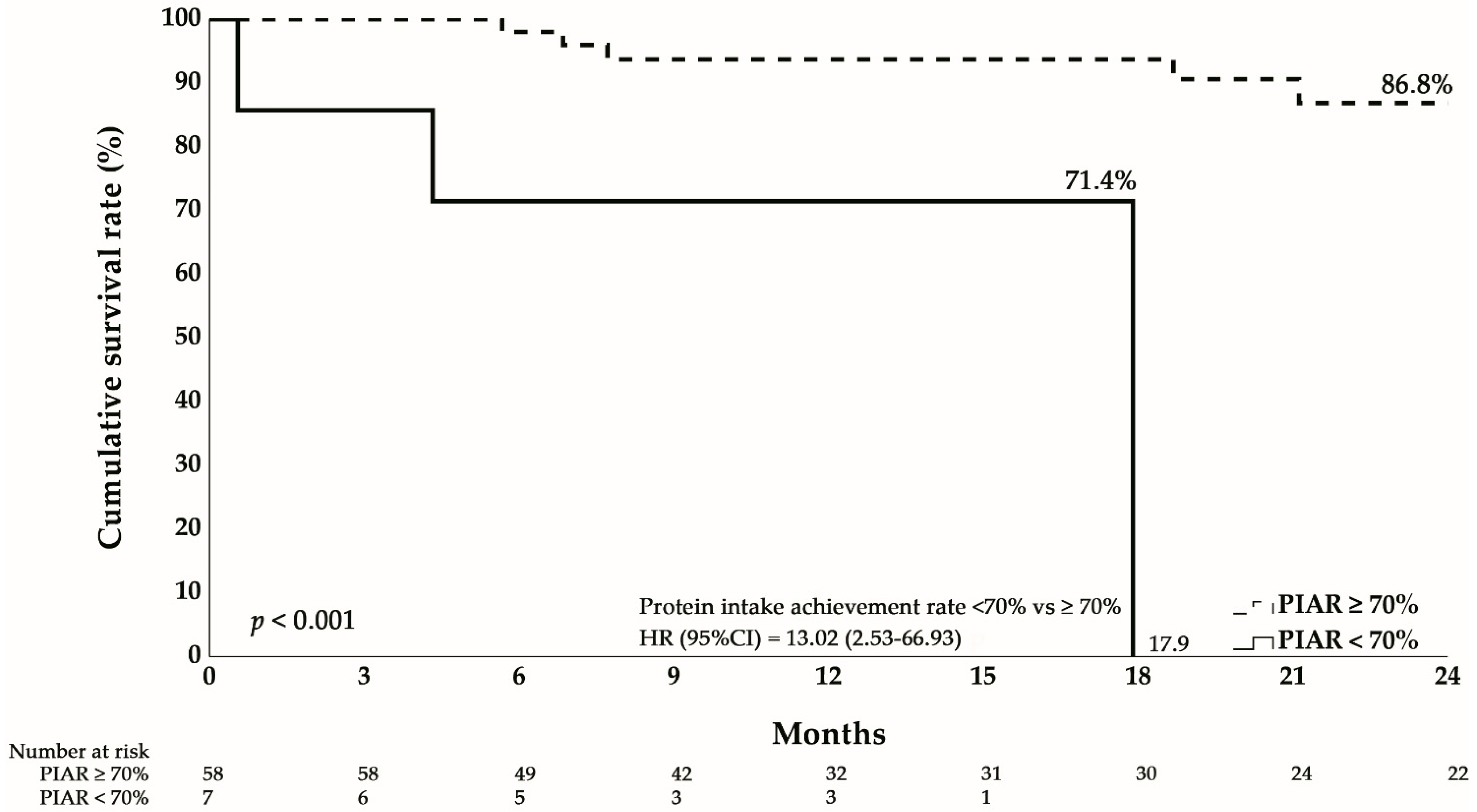 Figure 2. Kaplan–Meier survival curves depicting survival in gastric cancer patients, stratified by intake achievement rate of protein at 1 year after surgical intervention.