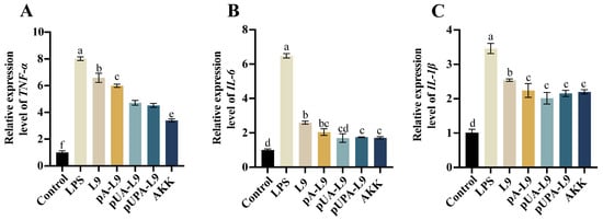 RAW264.7 cells (purchased from the Cell Bank, Chinese Academy of Sciences, Shanghai, China) were maintained in Dulbecco’s Modified Eagle Medium (DMEM, Gibco, Thermo Fisher Scientific, Waltham, MA, USA) supplemented with 10% (v/v) Fetal Bovine Serum (FBS, Biological Industries, Kibbutz Beit Haemek, Israel), 100 U/mL penicillin, and 100 μg/mL streptomycin (Beyotime, Shanghai, China) at 37 °C in a humidified incubator (3111, Thermo Fisher Scientific, Waltham, MA, USA) with 5% CO2. For experiments, cells were seeded at a density of 1 × 105 cells per well in 12-well plates and starved in serum-free DMEM for 12 h prior to treatment. The experimental groups were as follows: cells treated with DMEM complete medium without the addition of LPS and bacteria (Control), model cells treated with LPS but without bacteria (LPS), experimental cells treated with LPS and Lc. paracasei L9 with empty vector (L9), experimental cells treated with LPS and A. muciniphila (AKK), experimental cells treated with LPS and Lc. paracasei L9 expressing Amuc_1100 protein within cells (pA-L9), experimental cells treated with LPS and Lc. paracasei L9 secreting Amuc_1100 protein (pUA-L9), experimental cells treated with LPS and Lc. paracasei L9 displaying Amuc_1100 protein on surface(pUPA-L9). Subsequently, DMEM complete medium containing LPS (final concentration: 500 ng/mL) was added to each well (except for the Control group), and cells were incubated for 4 h under standard culture conditions (37 °C, 5% CO2). Recombinant bacteria to be added to each experimental group were cultured for 12 h. Subsequently, a 1 mL aliquot (1 × 109 CFU/mL) of live recombinant bacteria from each group was collected, washed three times with Hank’s Balanced Salt Solution (HBSS, Solarbio, Beijing, China), and resuspended in HBSS. The bacteria were then introduced to LPS-induced RAW264.7 cells (4 h induction) and incubated at 37 °C for 30 min. Upon completion of the experiment, cell samples from each group were collected for subsequent analysis.