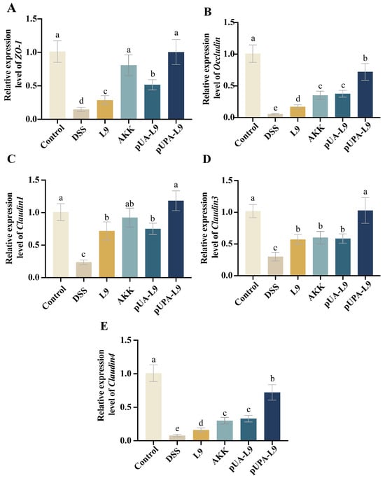Together with the tight junction data, these findings demonstrate that pUPA-L9 improves local intestinal barrier function by enhancing both the chemical barrier (mucus-associated factors) and the physical barrier (tight junction–related markers) of the gut epithelium.