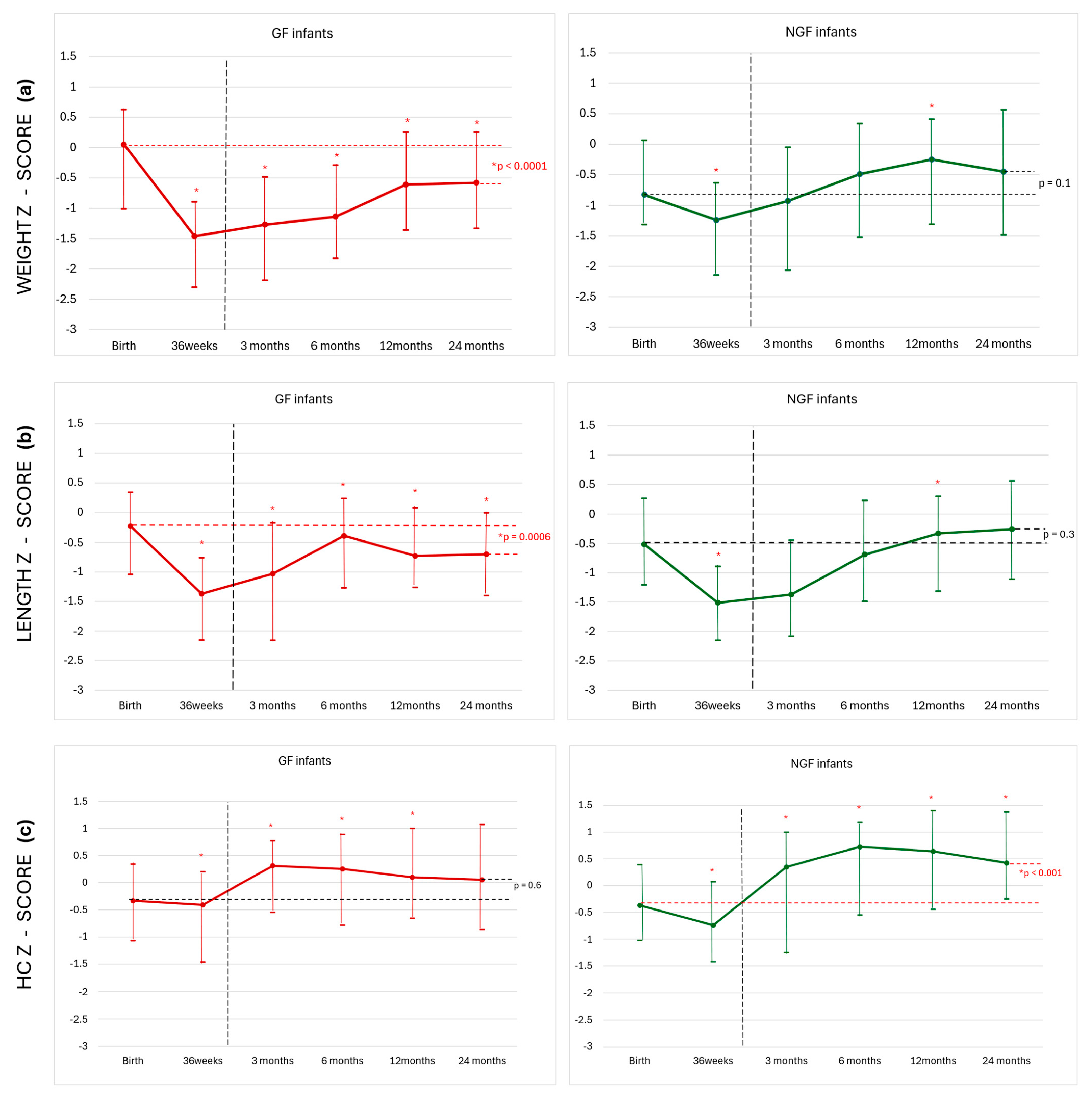 - Despite the possible role of nutrition after discharge, infants who suffered from growth failure early in life did not achieve weight z-scores at 2-year corrected age.