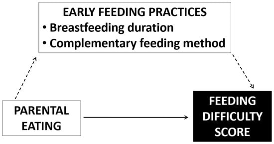 Figure 1 illustrates early feeding practices (BF duration and type of weaning) as potential mediators of parental eating. This formulation aligns with the observed, though not statistically significant, impact of parental eating on BF duration and type of weaning, where having two omnivorous parents appeared to be associated with an increased likelihood of BF for ≥9 months (44.6% vs. 40.5%; p-value = 0.504) and a decreased likelihood of adopting BLW (18.1% vs. 25.7%; p-value = 0.115). The possible causal pathway—that parental eating may only influence feeding difficulties in a direct way (solid line), independently from possible mediators—was confirmed in a conditional analysis that also includes the mediators. Parental eating still revealed an effect on feeding difficulties (both parents omnivorous: 0.46 (0.30–0.70), p < 0.0001; BF duration ≥9 months: 0.78 (0.60–1.02), p = 0.065; BLW: 0.72 (0.52–1.00), p-value = 0.052).