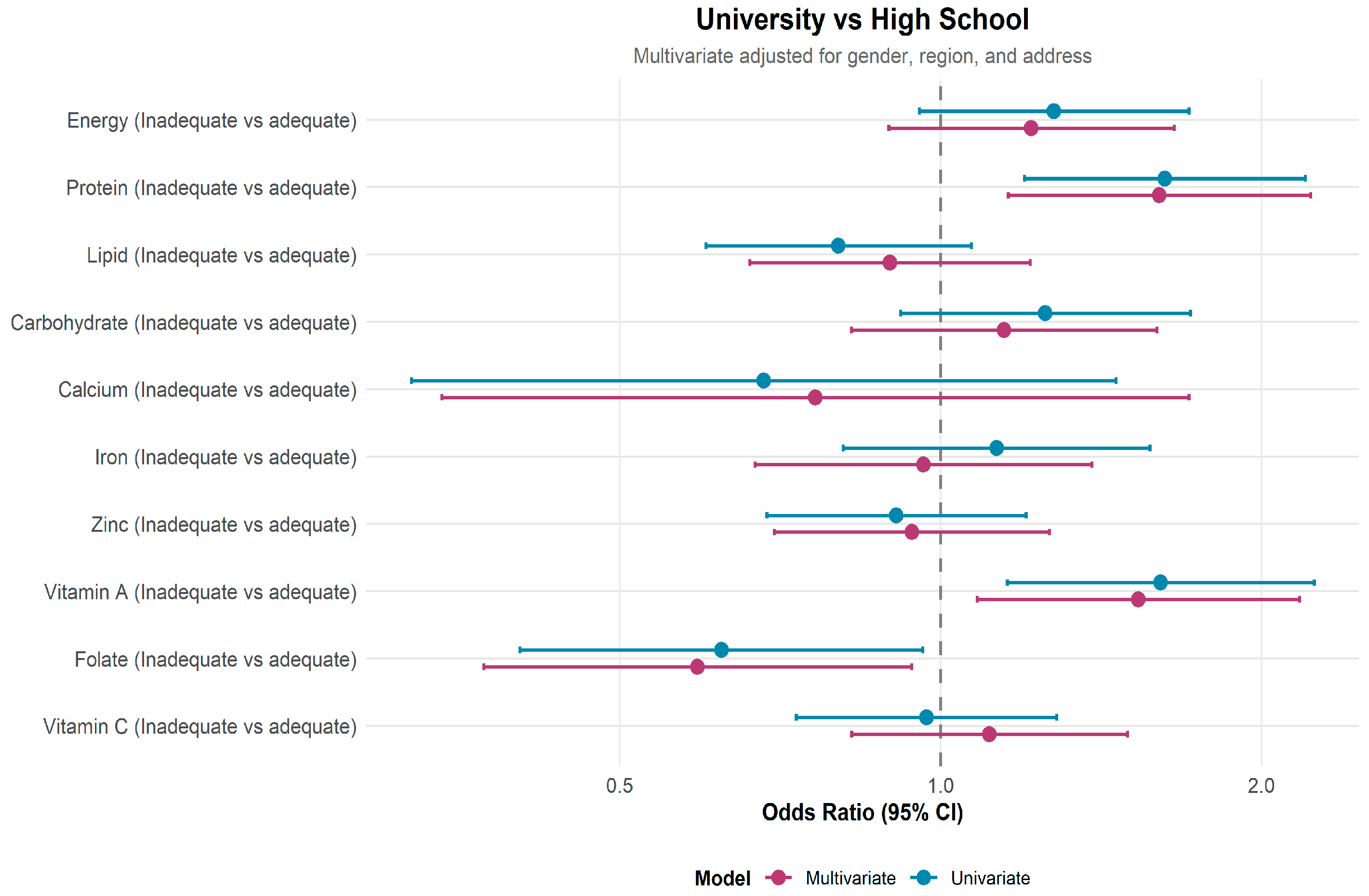 Crude and adjusted odds ratios for nutrient inadequacy among university students compared with high school students, adjusted for gender, region, and place of origin.