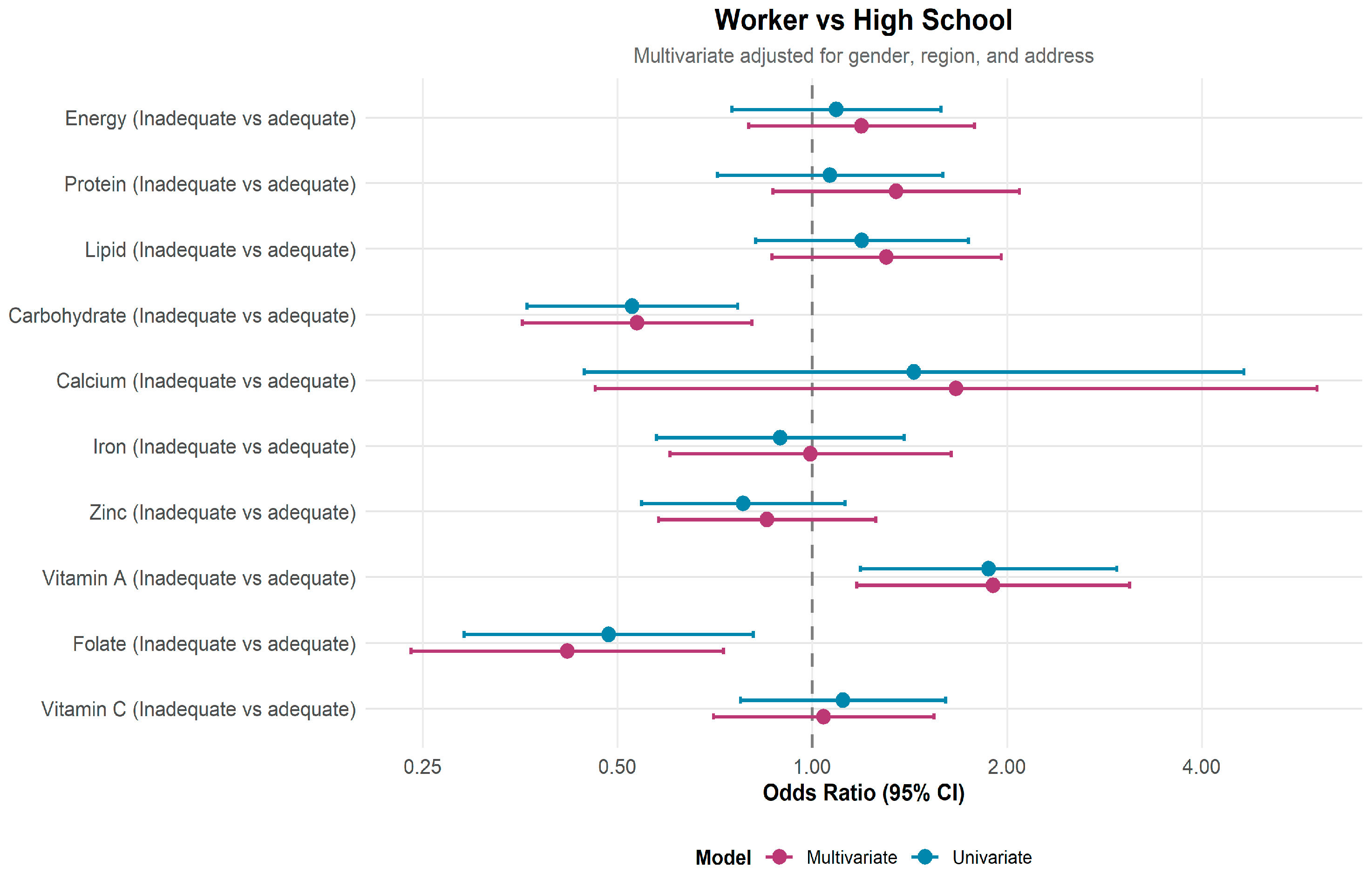 Figure 2 presents the crude and adjusted odds ratios for nutrient inadequacy among young workers compared to high school students (reference group). After adjustment for sex, region, and place of origin, young workers had lower odds of inadequate carbohydrate intake (aOR = 0.54; 95% CI: 0.36–0.81) and folate intake (aOR = 0.42; 95% CI: 0.24–0.73). In contrast, the odds of vitamin A inadequacy were higher among young workers (aOR = 1.90; 95% CI: 1.17–3.10). No significant differences were observed for energy, protein, lipid, calcium, iron, zinc, or vitamin C.