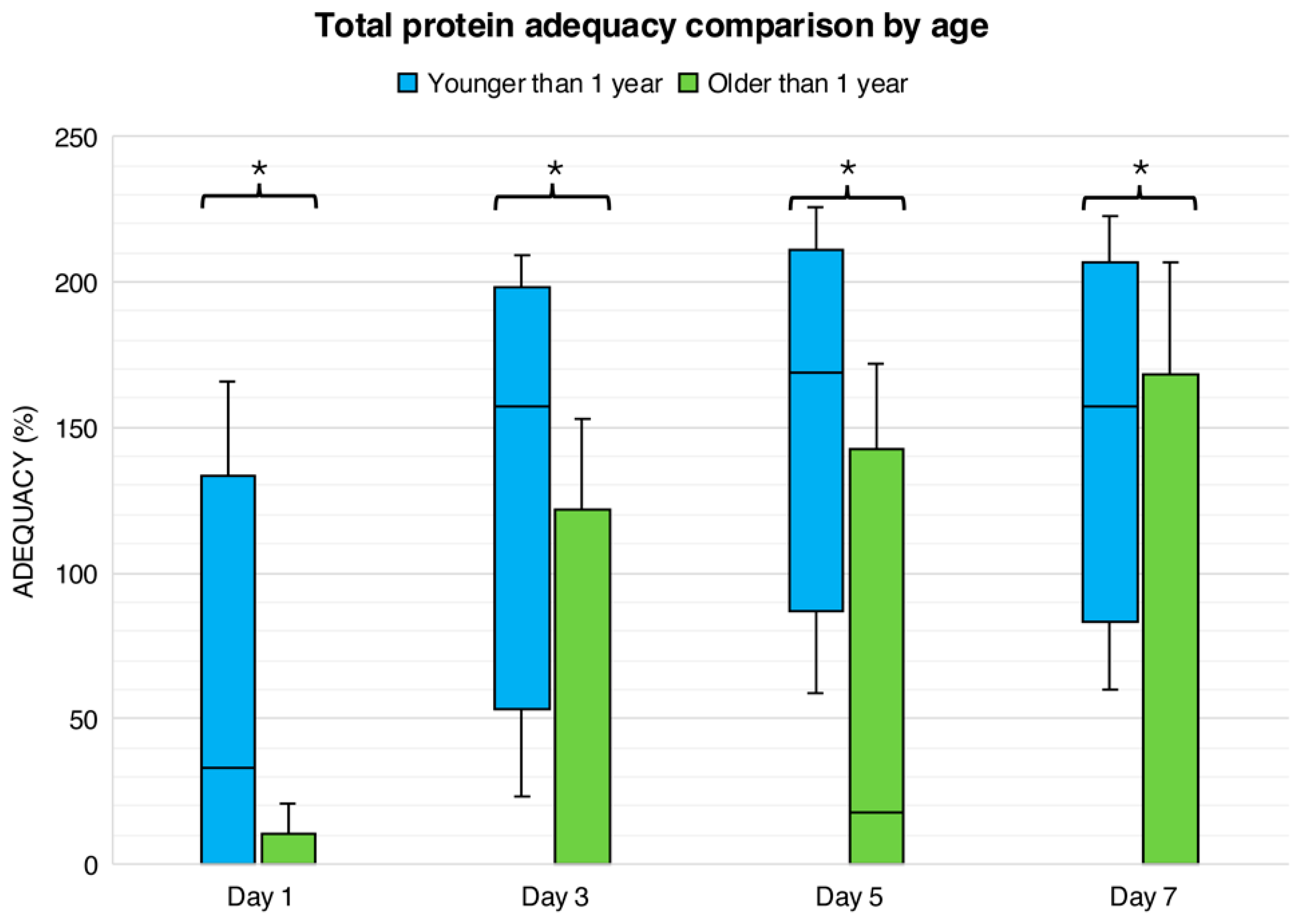 p < 0.001). For days 5 and 7, 38% of children younger than 1 year reached total protein goal adequacy, compared to 25% of children older than 1 year (