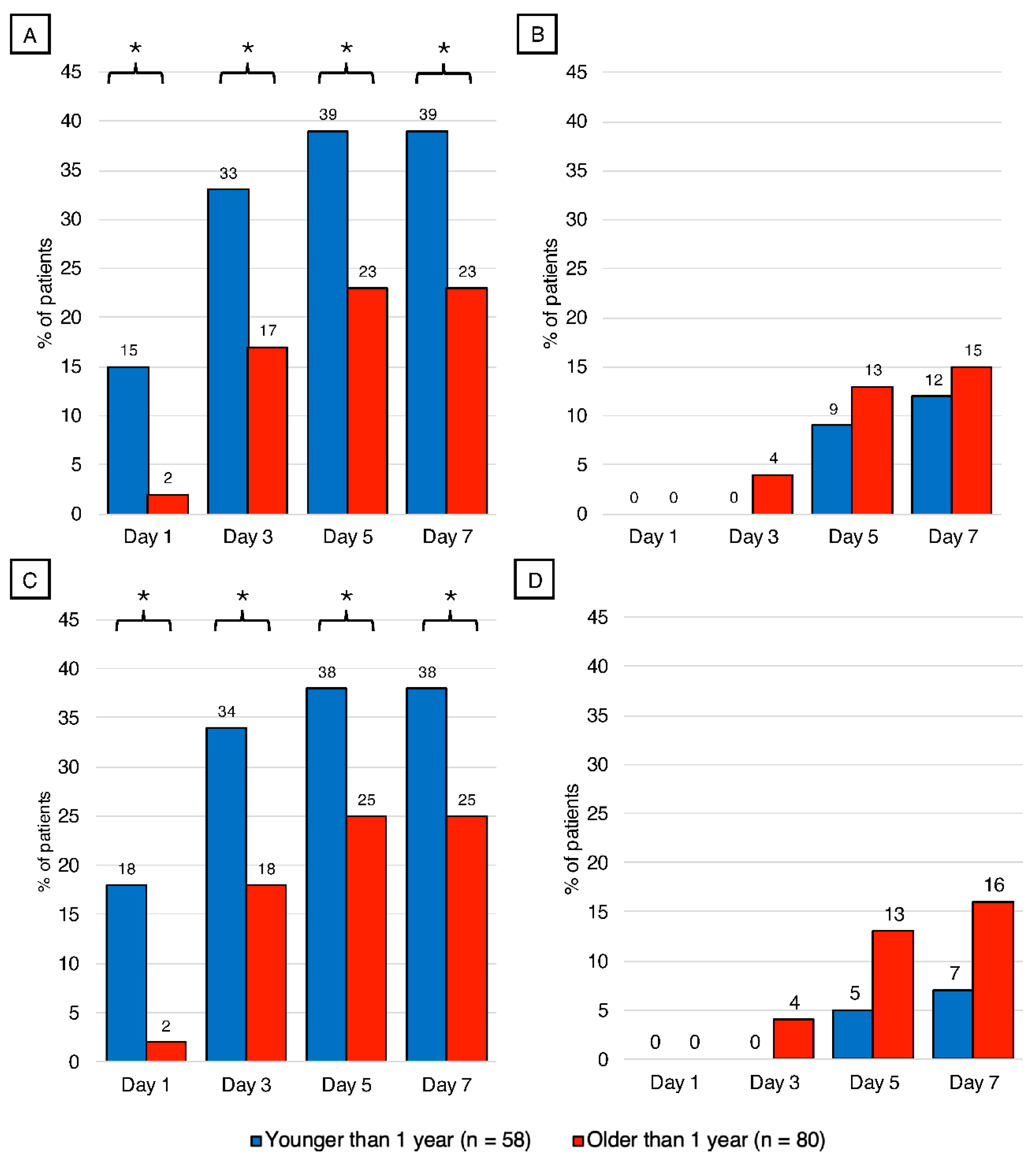 p < 0.001 for both days). On day 1, both groups reached 0% of goal adequacy for enteral nutrition support. For day 3, 4% of children older than 1 year reached caloric goal adequacy compared to 0% of children younger than one year (