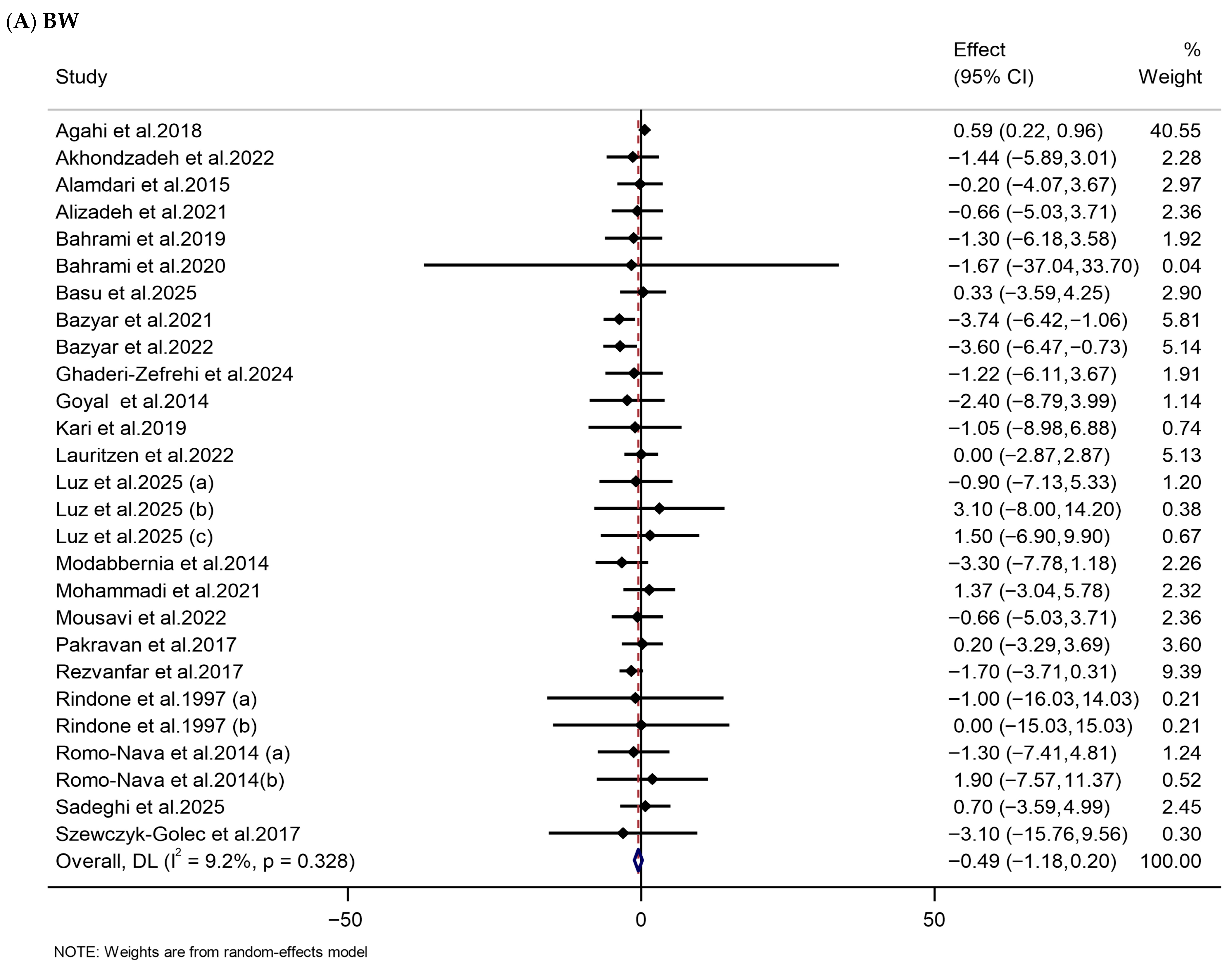 | BW (kg) | 27 | 1276 | −0.49 (−1.18, 0.20) | 0.163 | 9.2 | 0.328 | Moderate (II) |