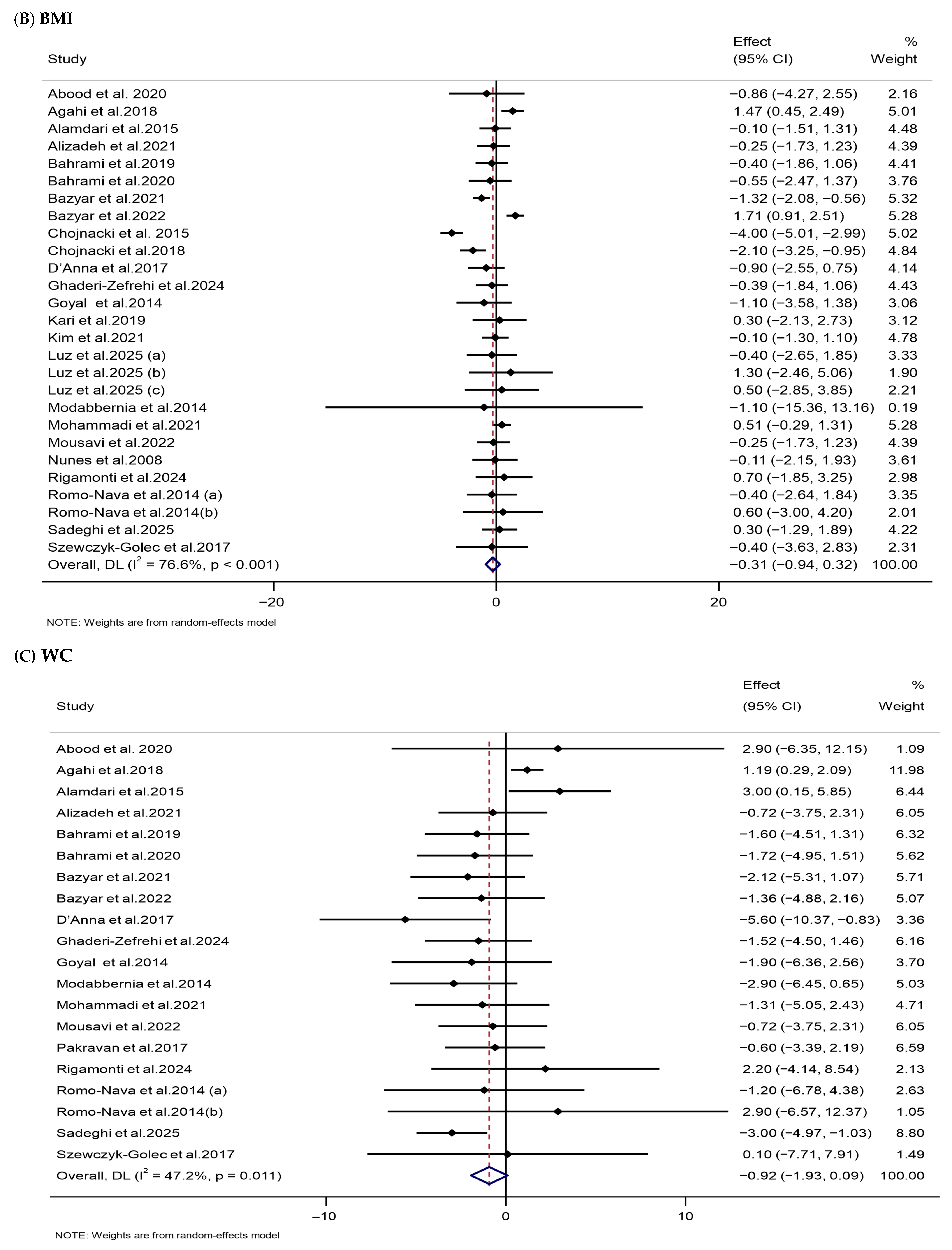 | WC (cm) | 20 | 908 | −0.92 (−1.93, 0.09) | 0.073 | 47.2 | 0.011 | High (I) |