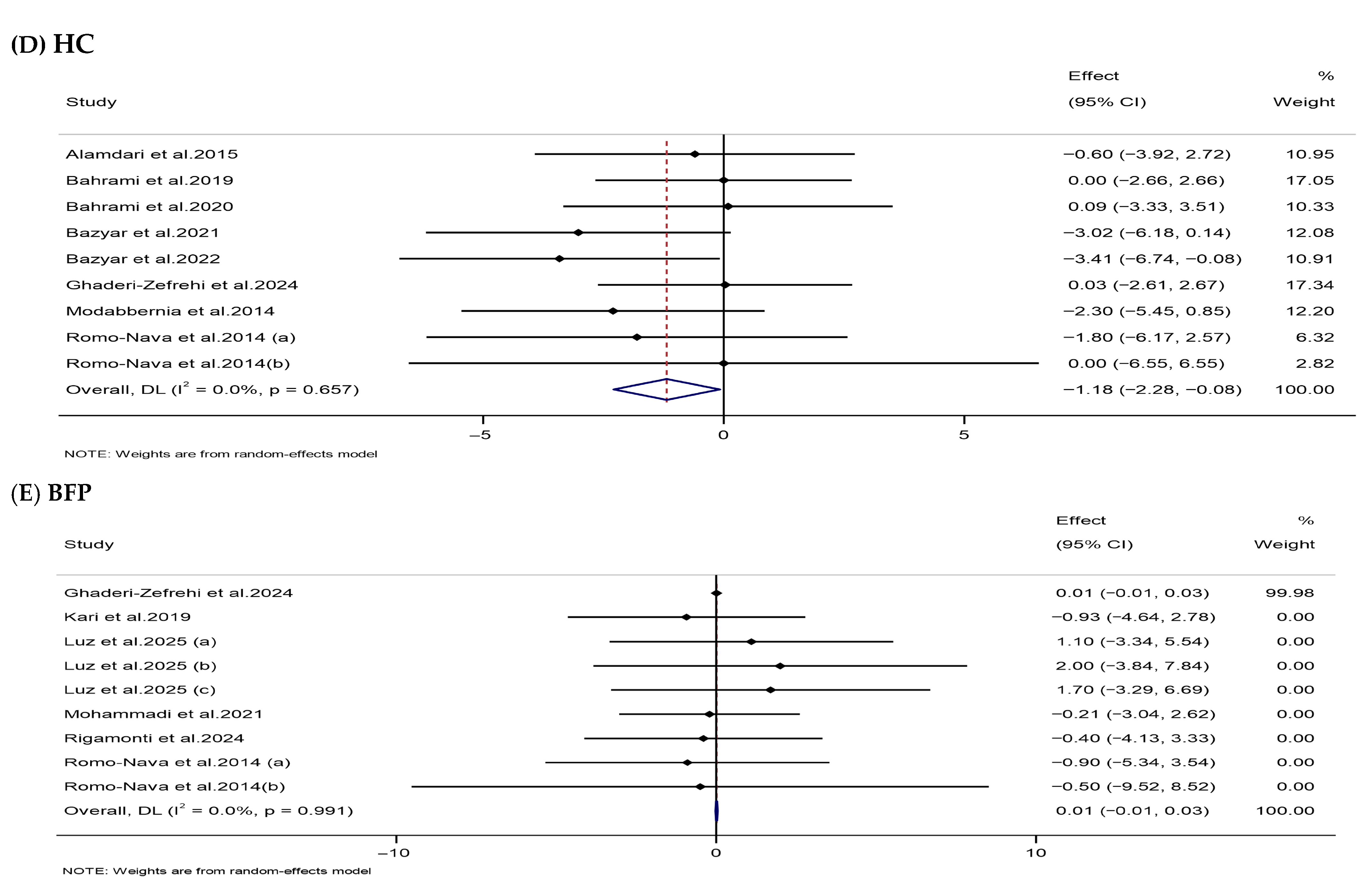 | HC (cm) | 9 | 396 | −1.18 (−2.28, −0.08) | 0.035 | 0 | 0.657 | Moderate (II) |