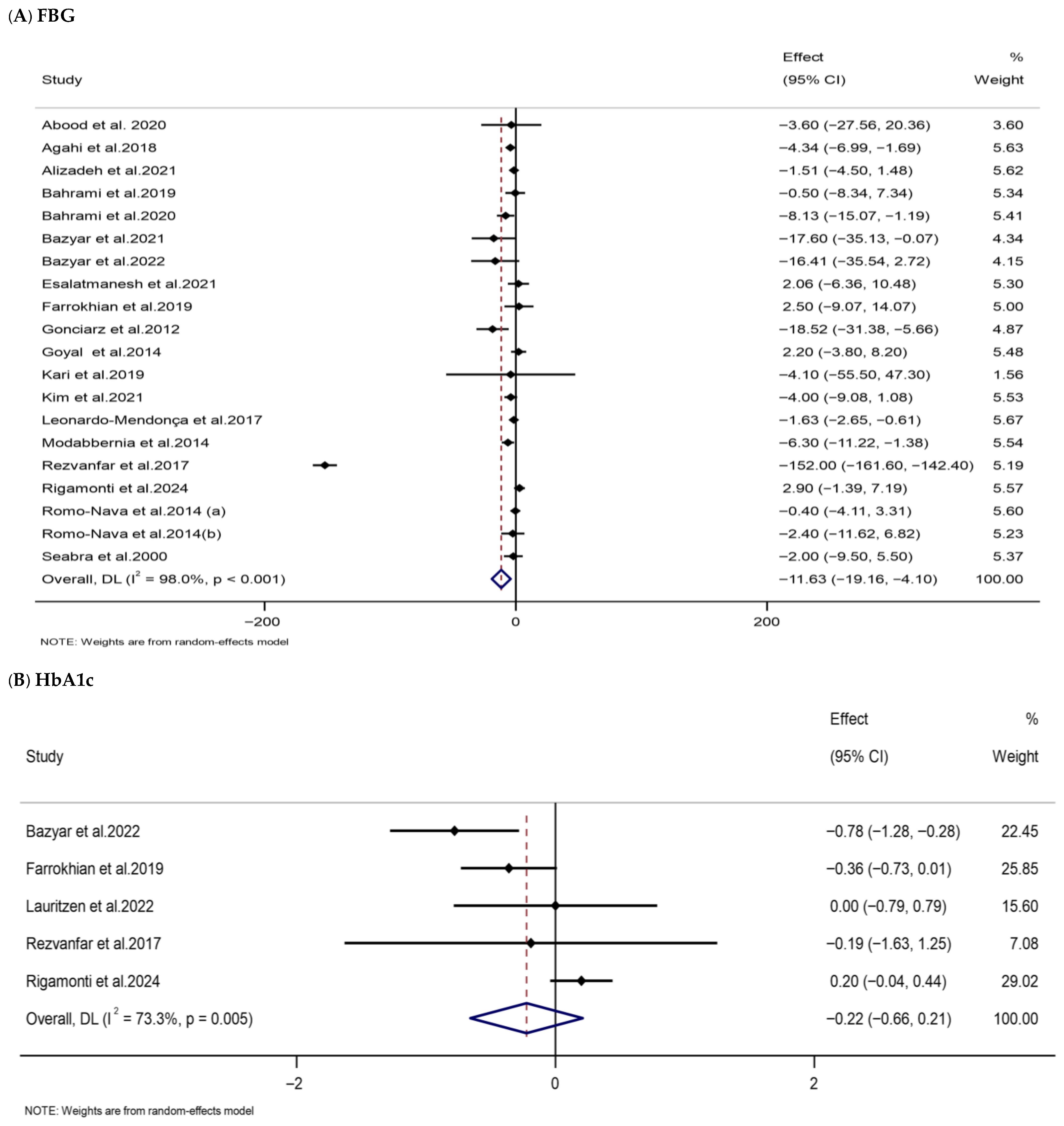 | FBG (mg/dL) | 20 | 958 | −11.63 (−19.16, −4.10) | 0.002 | 98 | <0.001 | Low (III) |