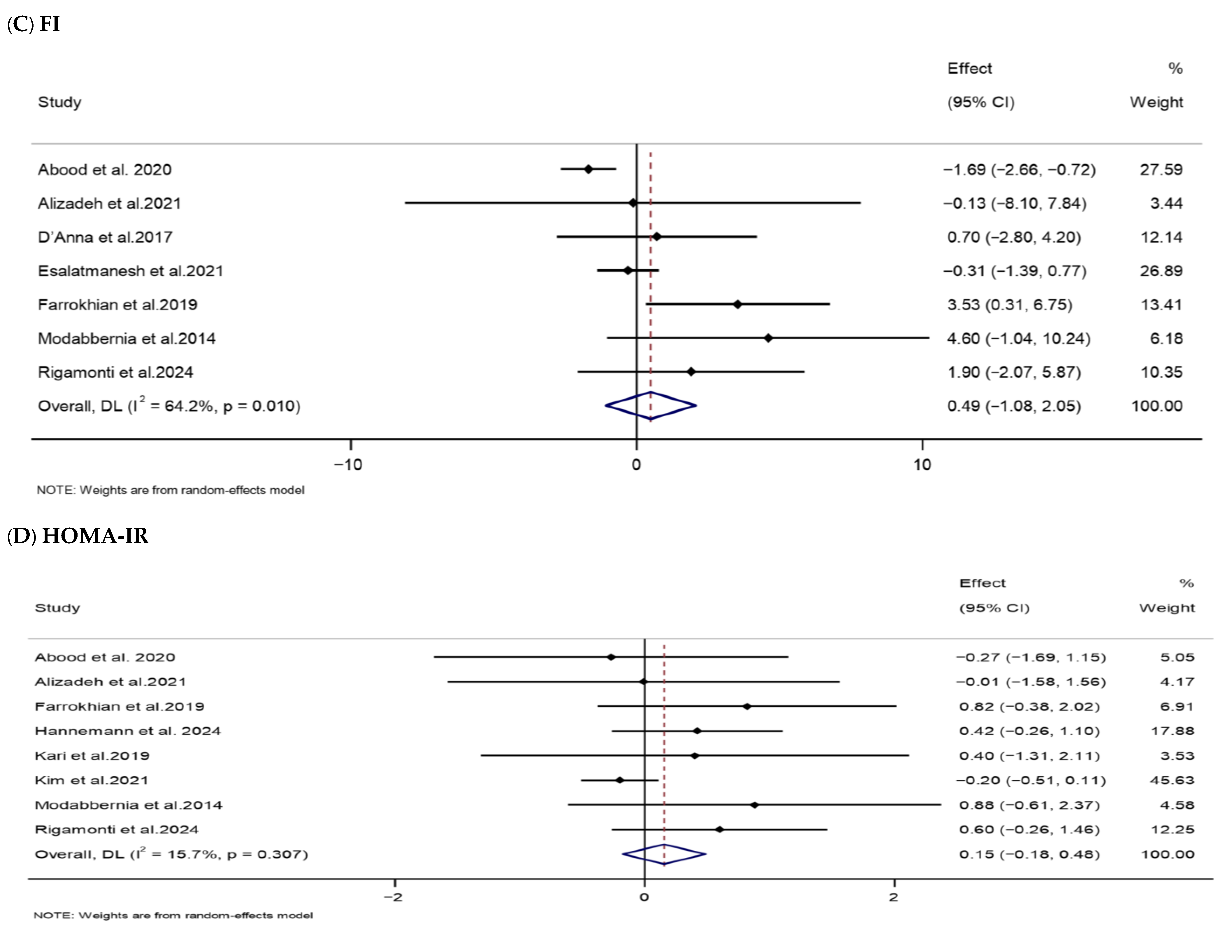| FI (µIU/mL) | 7 | 296 | 0.49 (−1.08, 2.05) | 0.544 | 64.2 | 0.010 | Low (III) |
