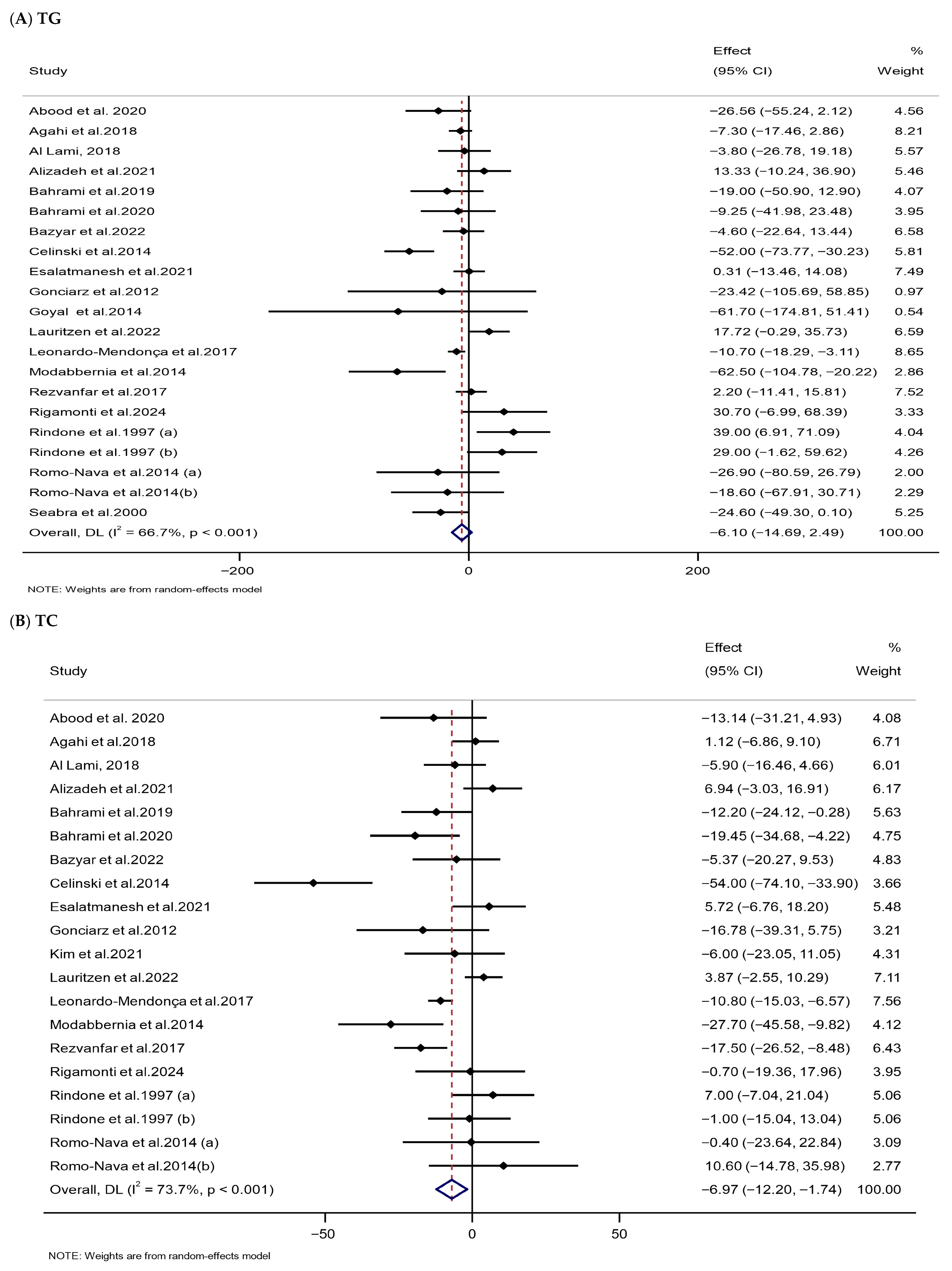 | TC (mg/dL) | 20 | 1006 | −6.97 (−12.20, −1.74) | 0.009 | 73.7 | <0.001 | Low (III) |
