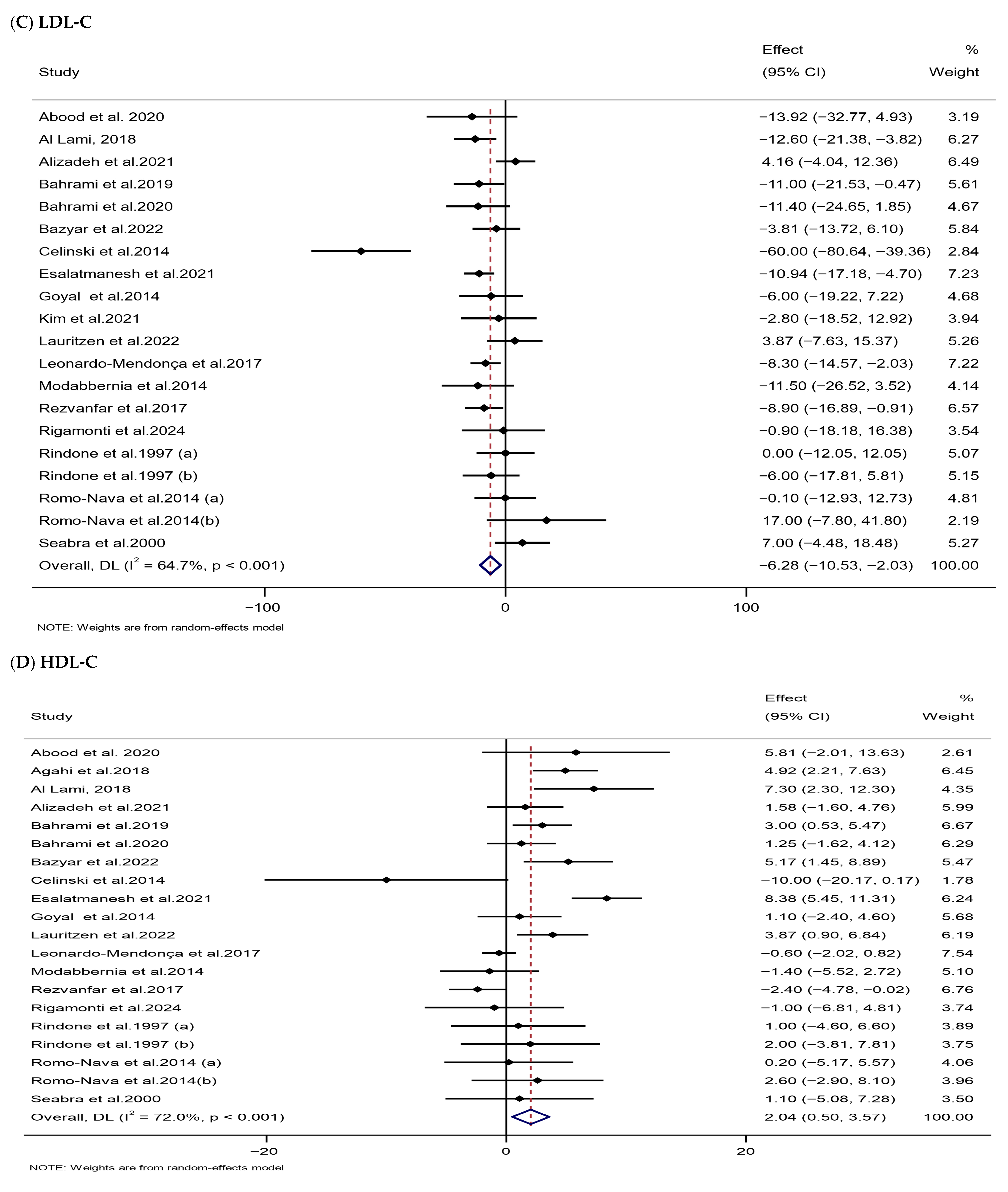 | HDL-C (mg/dL) | 20 | 1005 | 2.04 (0.50, 3.57) | 0.009 | 72 | <0.001 | Low (III) |