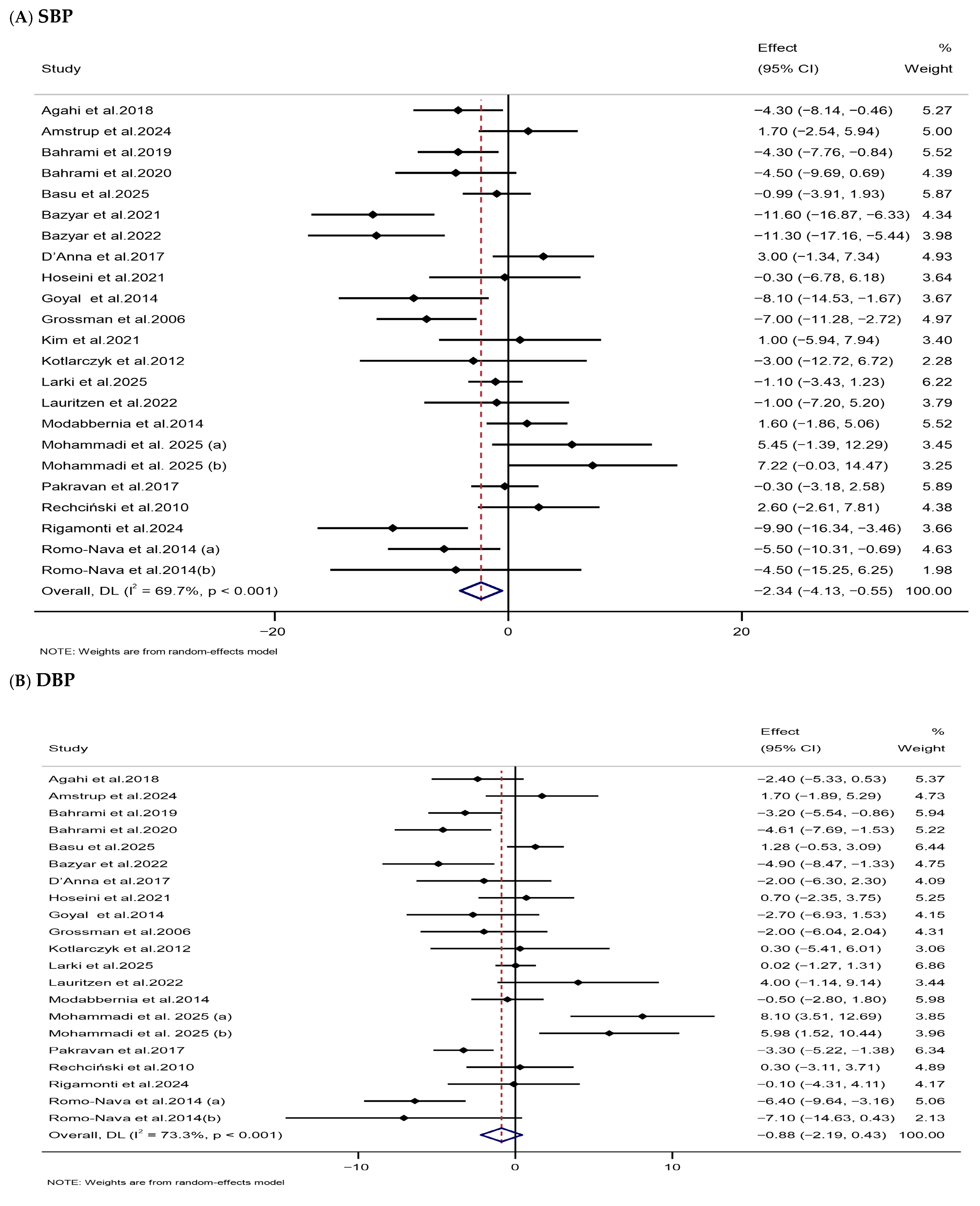 | DBP (mmHg) | 21 | 1069 | −0.88 (−2.19, 0.43) | 0.186 | 73.3 | <0.001 | Low (III) |