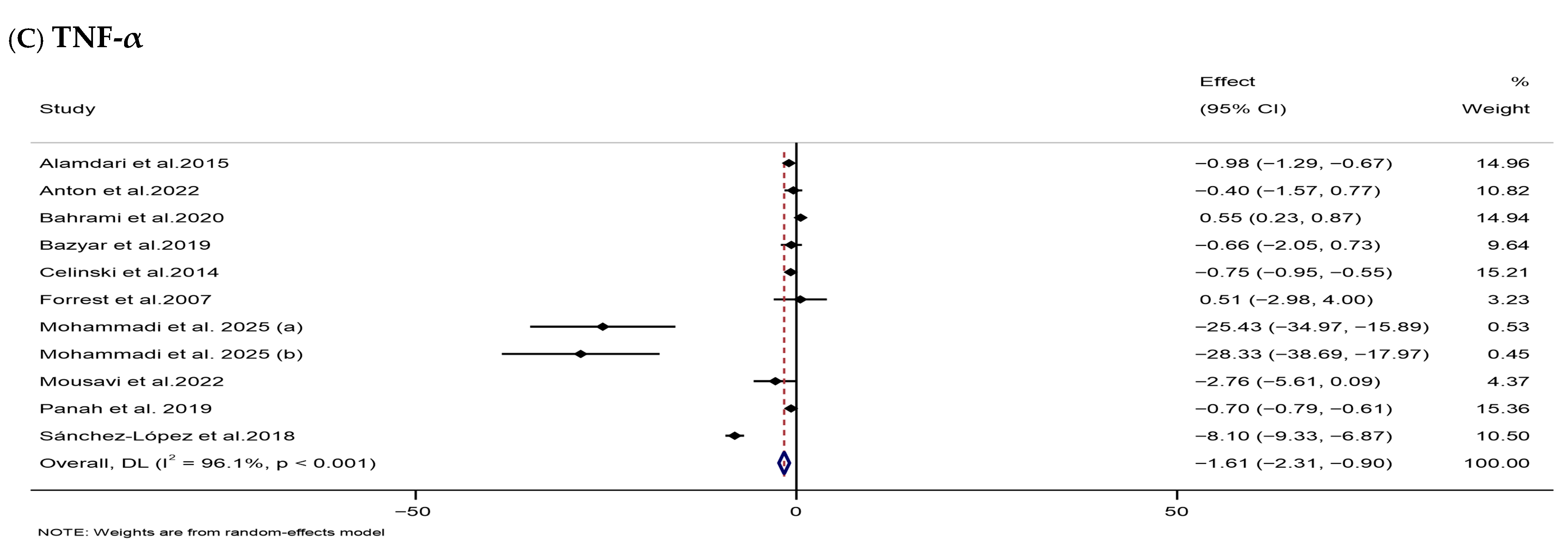 | TNF-α (pg/mL) | 11 | 488 | −1.61 (−2.31, −0.90) | <0.001 | 96.1 | <0.001 | Low (III) |