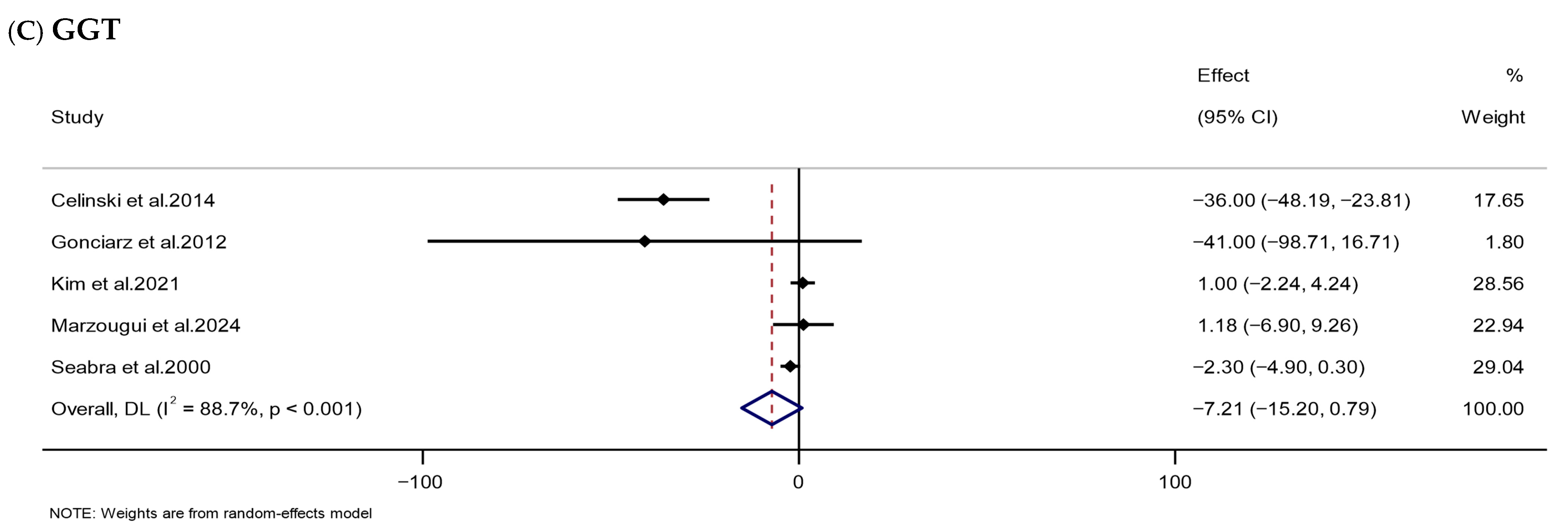 | GGT (IU/L) | 5 | 188 | −7.21 (−15.20, 0.79) | 0.077 | 88.7 | <0.001 | Low (III) |