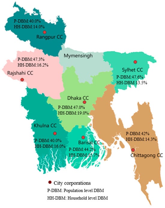 Locations of city corporations in Bangladesh and division-level DBM prevalence (population and household). (Note: Mymensingh division was included under Dhaka division before 2013).