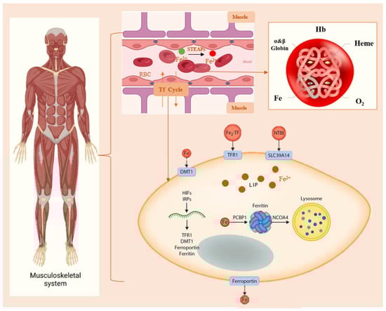 Iron deficiency is a common nutritional disorder, typically caused by inadequate dietary intake of iron, impaired absorption of iron, or excessive loss of iron. It readily leads to structural alterations and functional impairments in tissues and organs, triggering a variety of physiological manifestations. In terms of muscle function, iron deficiency leads to reduced strength, endurance and reaction speed. With regard to bone health, intracellular iron deficiency can disrupt the activity and homeostasis of osteocytes and osteoblasts, resulting in an imbalance in bone homeostasis and ultimately leading to bone loss or osteoporosis [42]. The mineral element iron helps to maintain myocardial integrity and energy metabolism, exerting a wide range of effects on cardiac function [43]. Furthermore, there are pathophysiological interrelationships between iron deficiency anaemia, renal dysfunction and heart failure; anaemia reduces tissue oxygenation, exacerbating heart failure symptoms [44]. A study examining the impact of iron metabolism on rhabdomyosarcoma (RMS) tumour growth demonstrated that iron supplementation effectively inhibits tumour proliferation. Maintaining elevated iron levels within cancer cells accelerates metabolic activity [45]. Additionally, restless legs syndrome (RLS) is a clinically prevalent neurogenic sensory-motor disorder. Evidence suggests that non-anaemic iron deficiency is a common predisposing factor for RLS and is potentially associated with alterations in mitochondrial energy metabolism and hypoxia-inducible factor expression [46]. All mammalian cells require iron, which binds to plasma transferrin receptors. Transferrin-mediated iron assimilation is critical for skeletal muscle metabolism, and studies indicate that intramuscular iron deficiency can cause severe systemic metabolic disorders [47]. However, iron deficiency can also cause muscle soreness. Iron is involved in haemoglobin synthesis, which aids the transport of oxygen to tissues throughout the body. When iron is insufficient, muscles may be forced into anaerobic metabolism due to hypoxia and impaired energy metabolism. This leads to increased lactic acid accumulation and symptoms such as muscle soreness and fatigue, which are particularly noticeable after intense exercise [48]. In summary, maintaining iron homeostasis relies on the proper functioning of iron regulatory mechanisms throughout the body. Further investigation is warranted into the iron metabolic pathways within muscle tissue and their underlying molecular biological mechanisms. As both iron deficiency and overload are detrimental to muscle health, strict regulation of iron homeostasis in muscle tissue is essential for appropriate iron metabolism.
