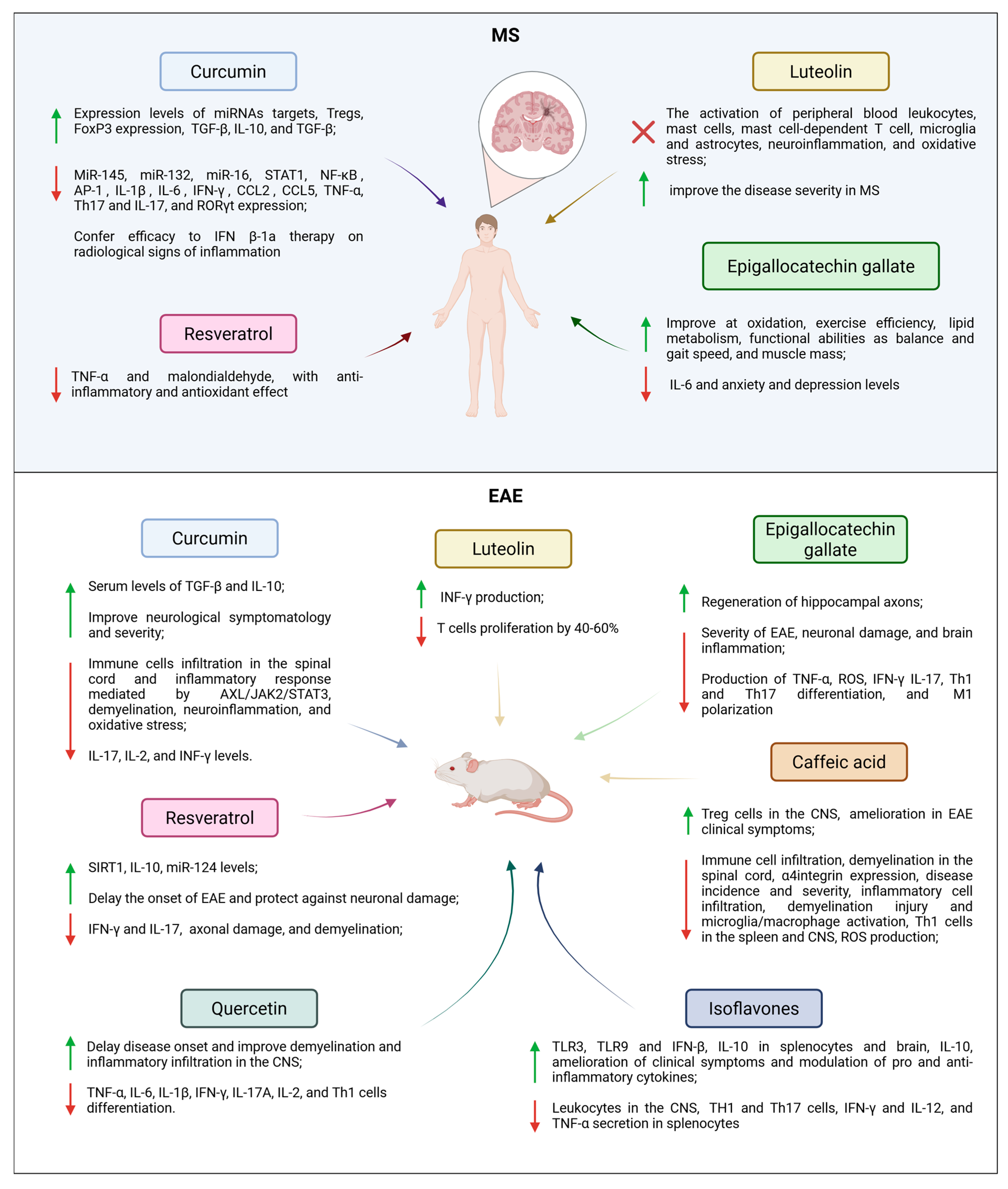 | E (Tocopherol) | ↑ oligodendrocyte regeneration and remyelination [70]; ↓ EAE severity and delay disease progression by suppressing T cell proliferation and the Th1 immune response [71]. | Lower vitamin E in MS serum [54]; ↓ in lipid peroxidation in serum and maintain telomere length in circulating lymphocytes [72]; No ↓ in the risk of MS onset [56]. |