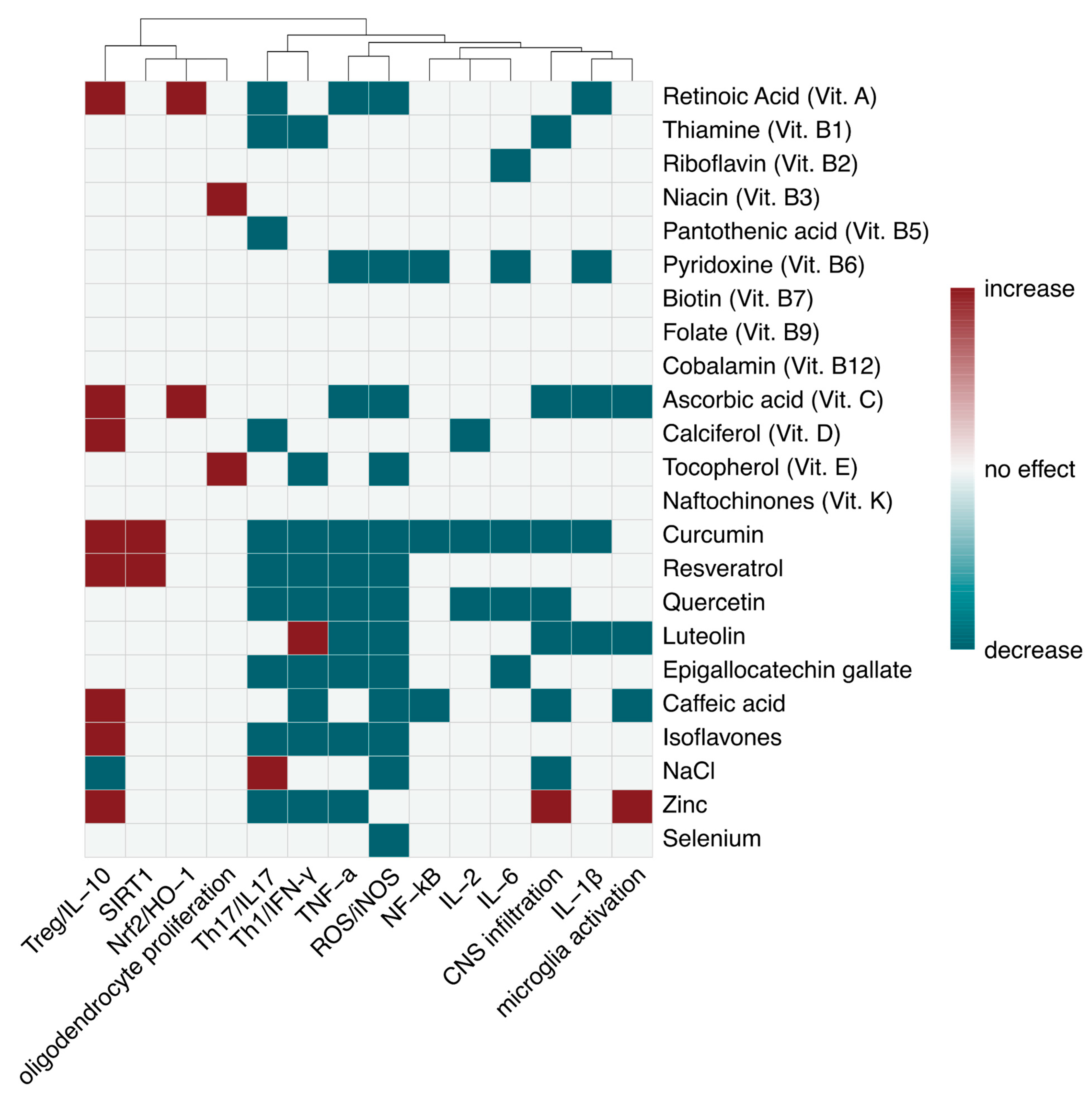 | K (Naphthoquinones) | Improvement in disease outcome [73]. | Low Vitamin K levels in MS [74]. |
