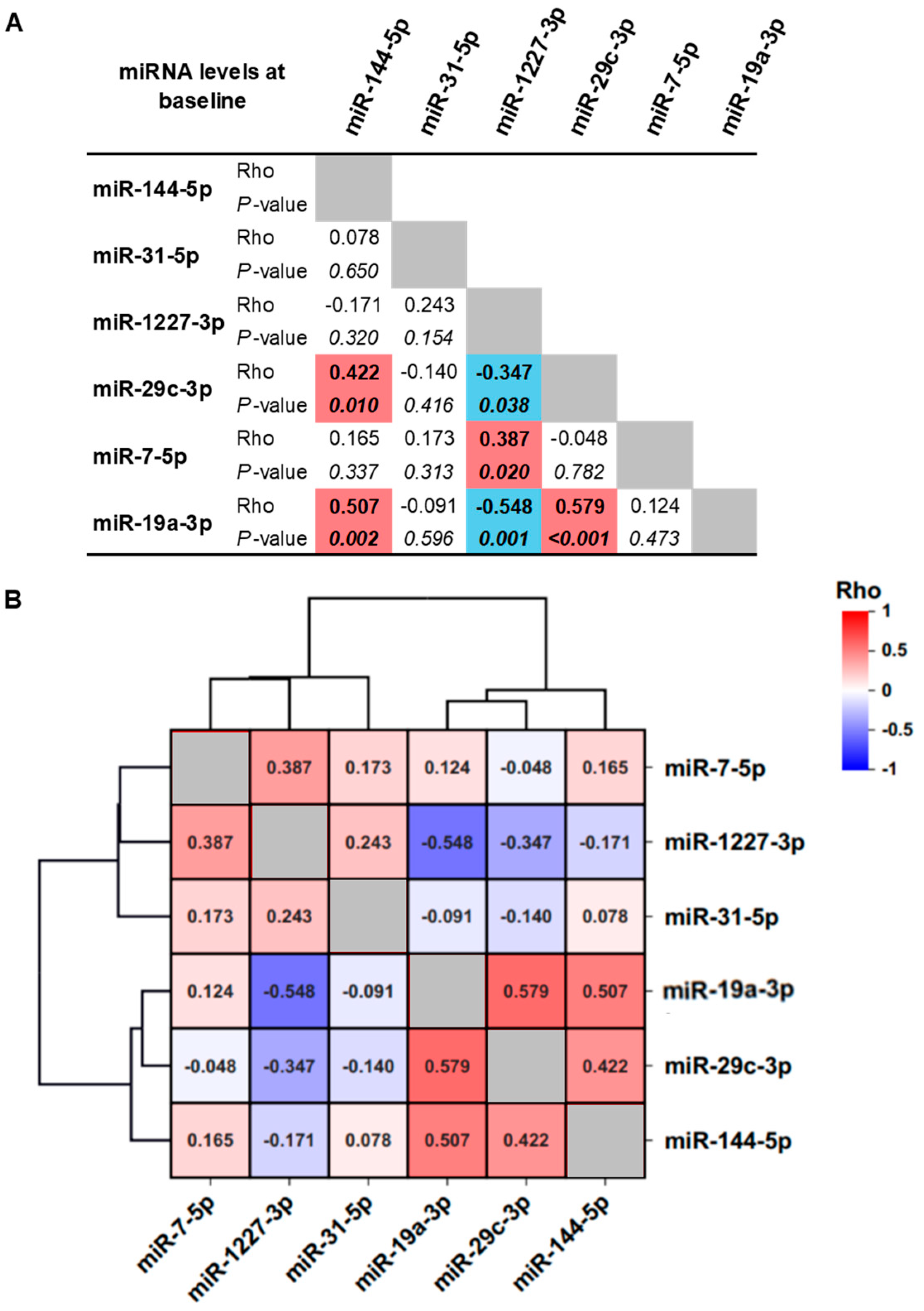 Spearman’s correlation analysis of these miRNAs revealed two distinct clusters based on significant associations in their baseline expression patterns: Cluster 1 comprising miR-144-5p, miR-29c-3p, and miR-19a-3p (positive correlations); and Cluster 2 comprising miR-1227-3p, miR-29c-3p, and miR-19a-3p (negative correlations). In addition, miR-1227-3p showed a positive correlation with miR-7-5p (