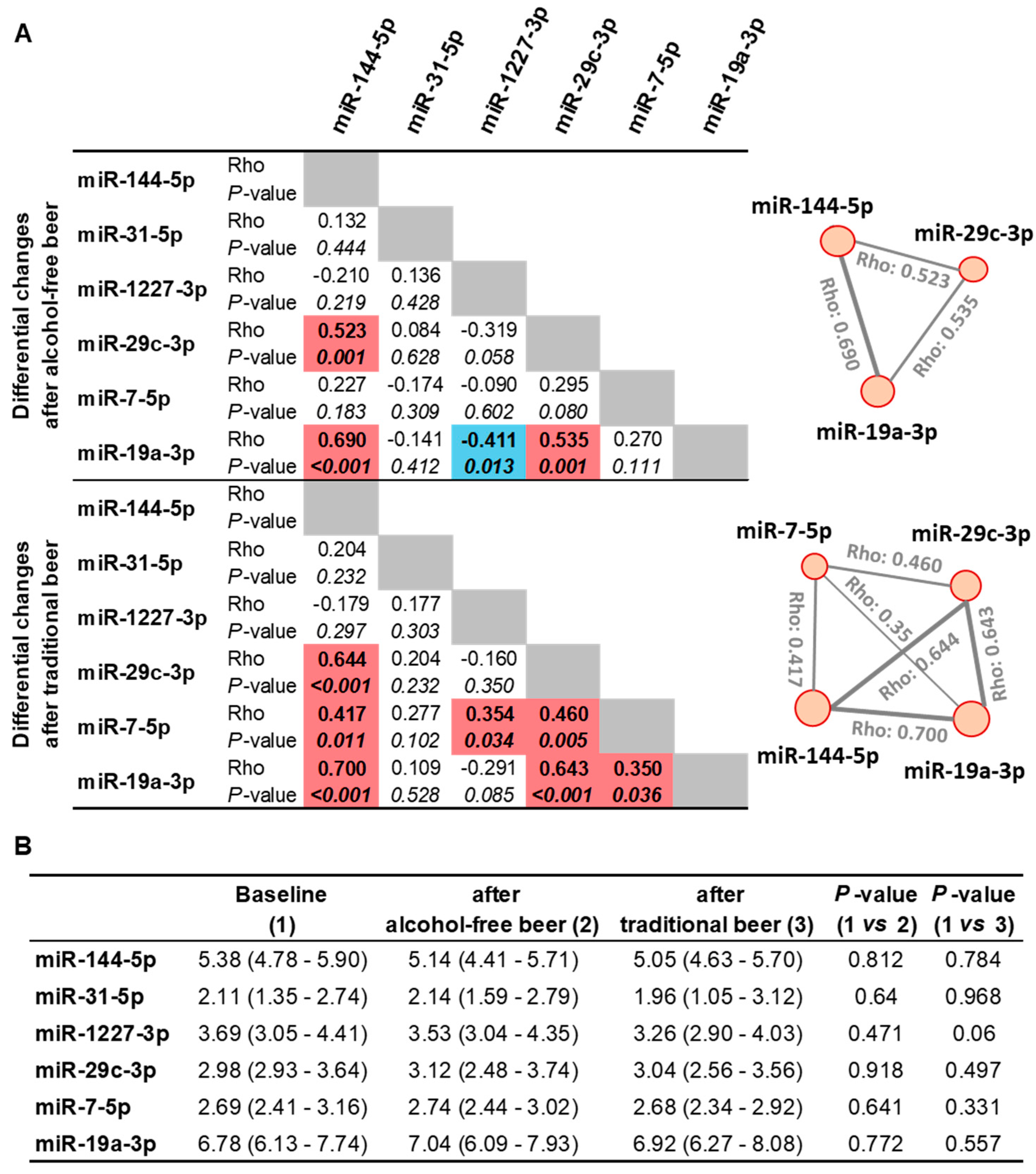 Figure 3A). Notably, miR-7-5p and Cluster 1 showed changes following the traditional beer intervention, although with a weaker association strength after alcohol-free beer. After beer consumption, miR-31-5p did not cluster with any other miRNA.