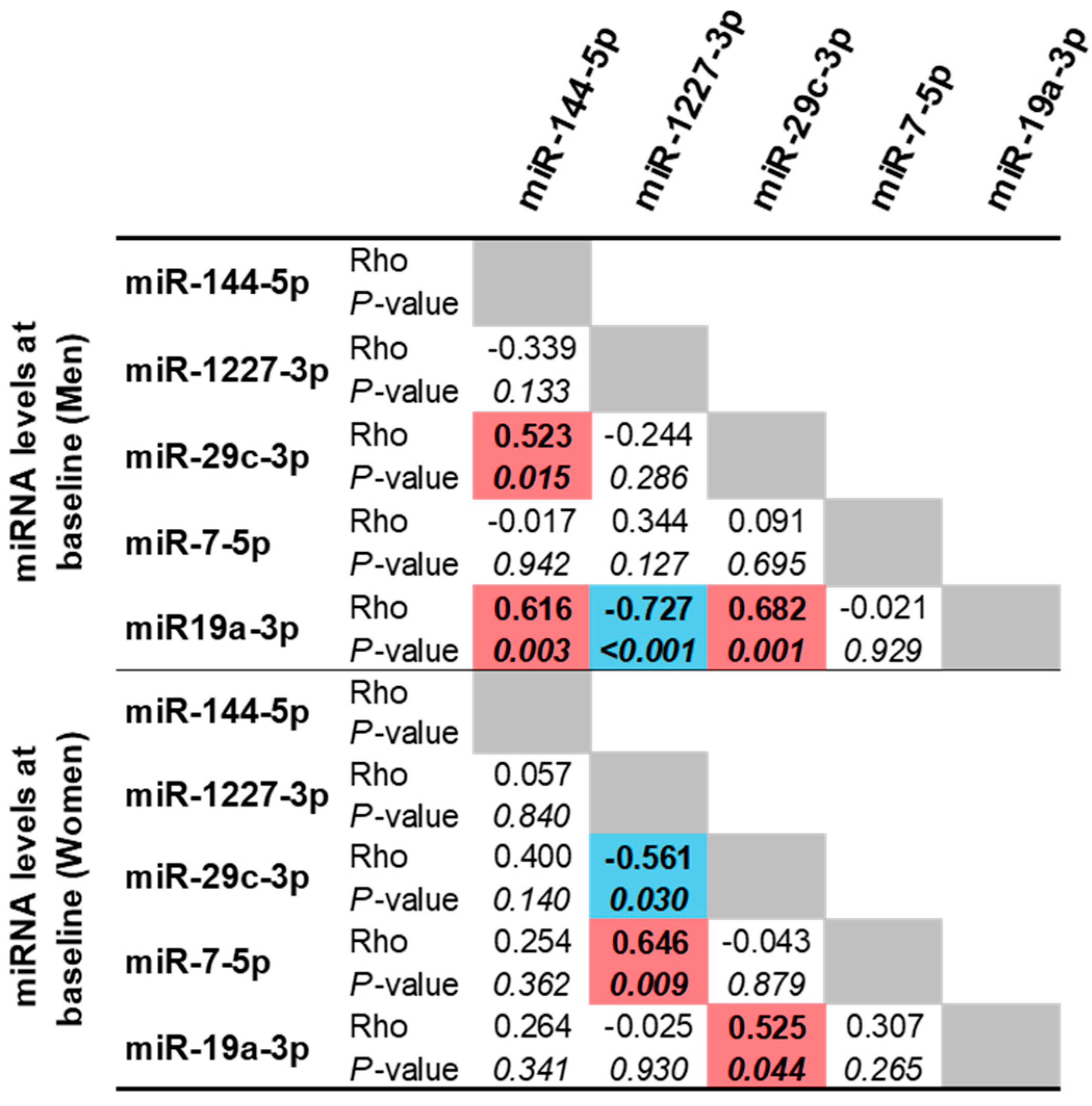 Figure 4, the miRNAs in Cluster 1 showed significant associations in men. In women, these correlations were weaker for miR-144-5p with miR-29c-3p and for miR-144-5p with miR-19a-3p but remained significant between miR-29c-3p and miR-19a-3p.
