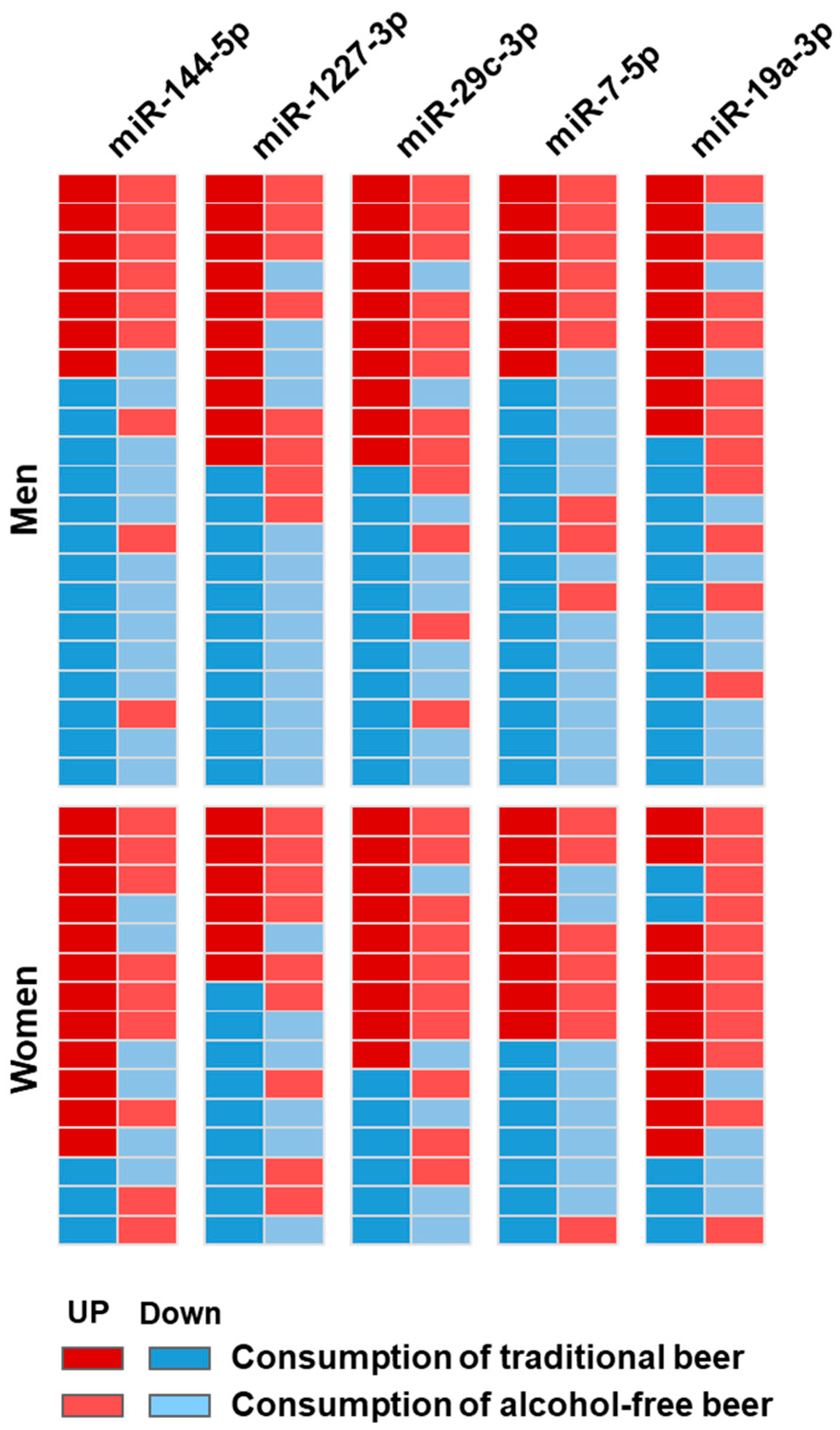 Figure 6). miR-144-5p and miR-19a-3p did not show significant changes relative to baseline after the consumption of alcohol-free beer. No changes were observed for the other three miRNAs (miR-1227-3p, miR-29c-3p, and miR-7-5p) either in men or in women after traditional or after alcohol free beer (