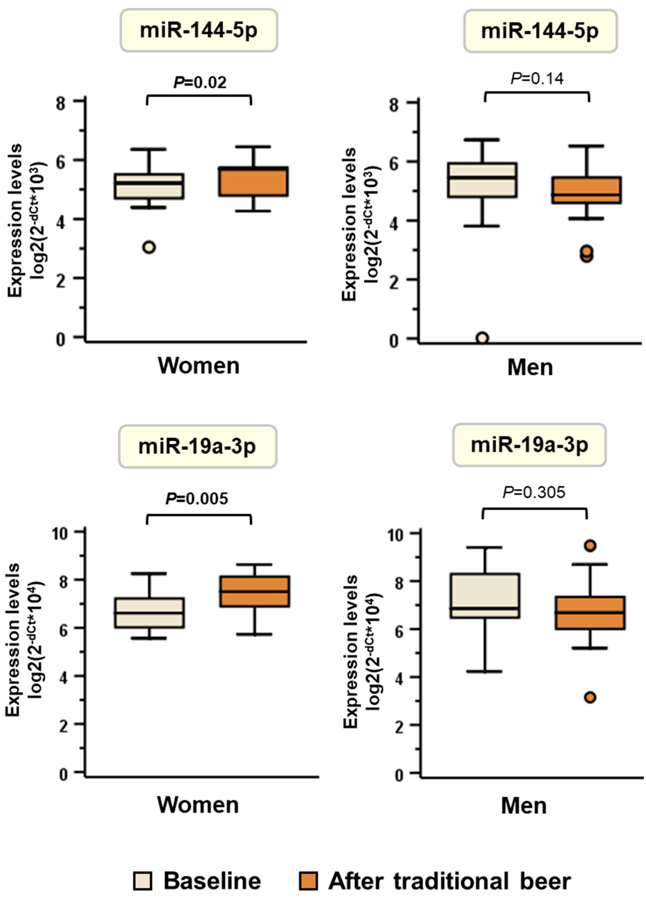 Consistent with these observations, median [IQR] expression levels of miR-144-5p and miR-19a-3p significantly increased in women after the 4-week traditional beer intervention, whereas men showed a nonsignificant trend toward decreased expression (