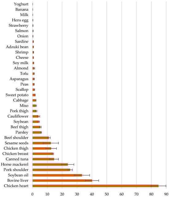 Different food sources providing Ubiquinol-10 (µg/g wet weight). Source: Data values extracted from Kubo et al. (2008) [38].
