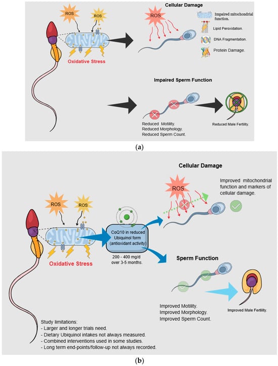 (a) Mitochondrial function, oxidative stress, and sperm attributes. (b) Ubiquinol, sperm attributes, and infertility management.