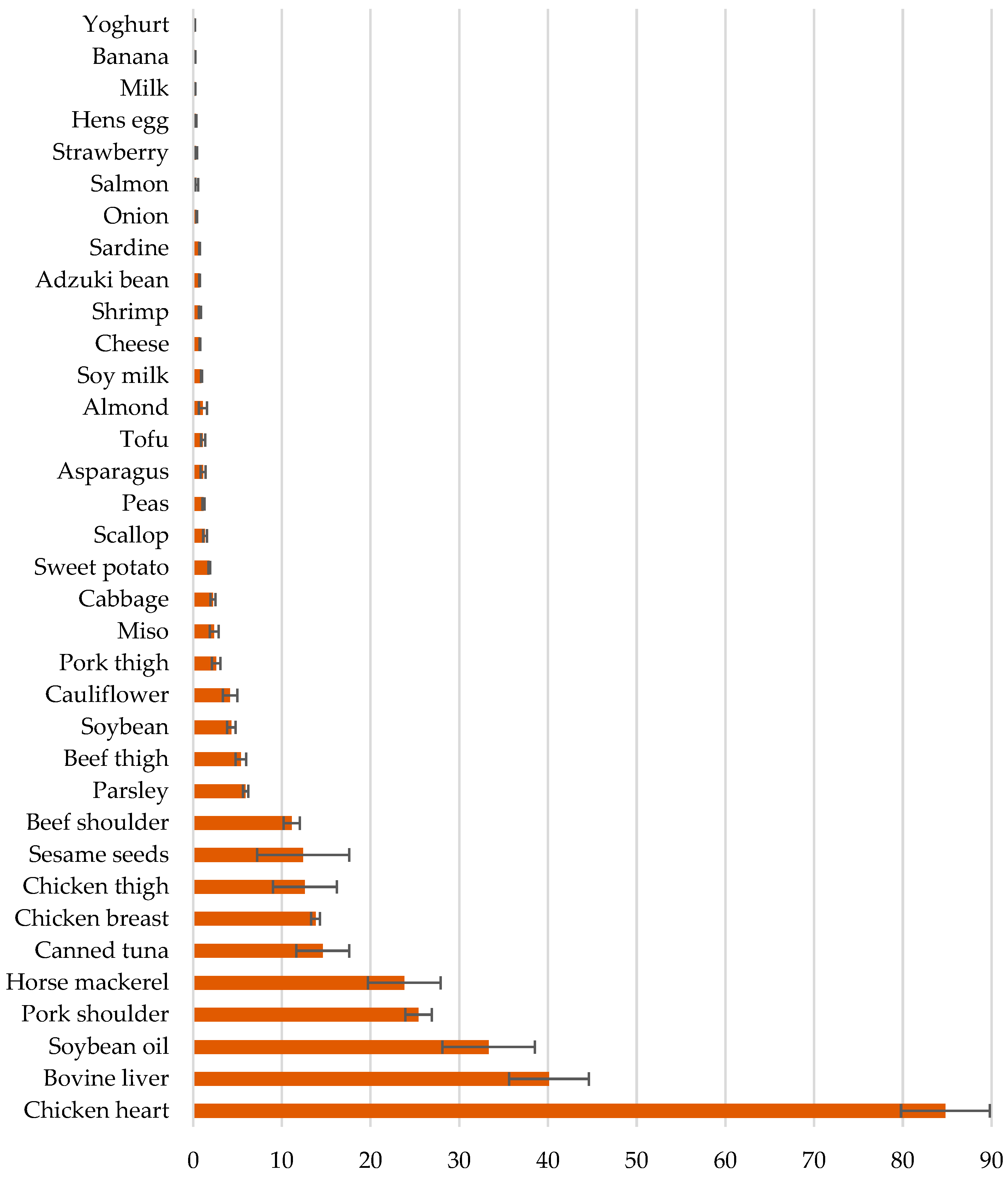 - Kubo, H.; Fujii, K.; Kawabe, T.; Matsumoto, S.; Kishida, H.; Hosoe, K. Food content of ubiquinol-10 and ubiquinone-10 in the Japanese diet. J. Food Compos. Anal. 2008, 21, 199–210. [Google Scholar] [CrossRef]