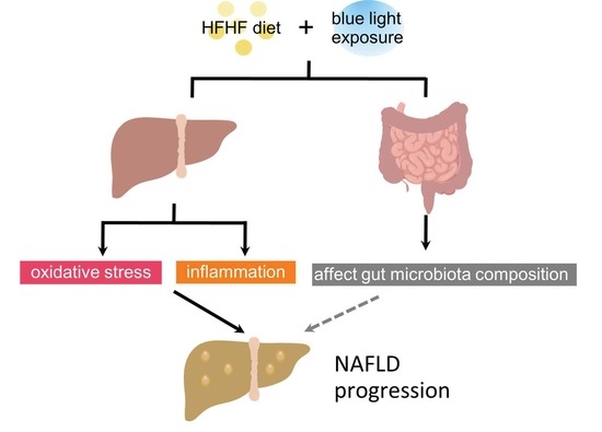 In this study, we obtained interesting results that differ from previous research on the potential eye damage caused by blue light. In addition to consuming an unhealthy diet that is high in fat and sugar, daily exposure to a certain amount of blue light may have the potential to increase oxidative and inflammatory responses in the body, which may accelerate the progression of liver disease. However, the present study still has some limitations. For example, considering the acceptance of blue light stimulation, we prioritized selecting an albino animal strain, but this strain may not be the most sensitive choice for liver or metabolic disorders. Although the daily blue light exposure time in this experiment was not as long as in other experiments, the possible impact on the circadian rhythm still cannot be completely ruled out. Additionally, since neither the diet nor the blue light exposure dose in this experiment is considered to cause acute damage, the study duration may not be long enough, and the sample size for gut microbiota analysis may have affected statistical power. A longer experimental period might be needed to observe more pronounced results. Due to changes in modern living environments and dietary patterns, many metabolic abnormalities have arisen. Besides diets rich in high-fat and high-sugar foods, the effects of extensive blue light exposure in modern life cannot be ignored. Therefore, understanding the potential combined effects and mechanisms under conditions that involve both dietary and environmental factors is crucial for developing future prevention and improvement strategies, as well as for furthering clinical research. Our present study has established preliminary data, and future studies may consider more related issues to further clarify the underlying mechanisms.