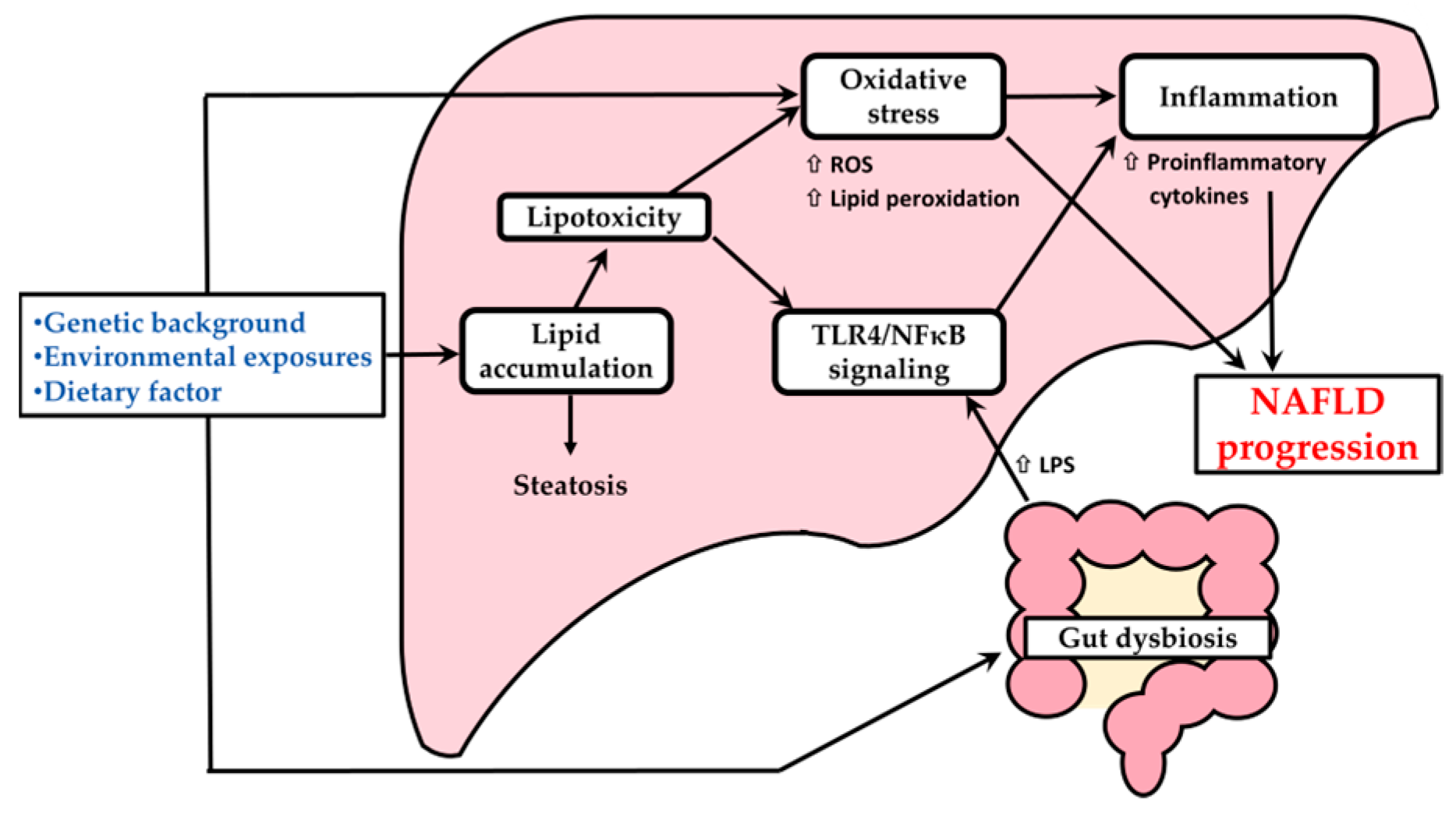 1]. The pathogenesis of NAFLD is a complex process that can potentially progress from simple hepatic lipid accumulation to mild or severe inflammation, ultimately resulting in tissue damage and fibrosis. In recent years, the multiple hit hypothesis has been the most reported, indicating that NAFLD may be caused by the interaction of various factors, including many genetic and external environmental factors, the release of pro-inflammatory substances, and the influence of the gut-liver axis, all of which may play roles in the progression of NAFLD [