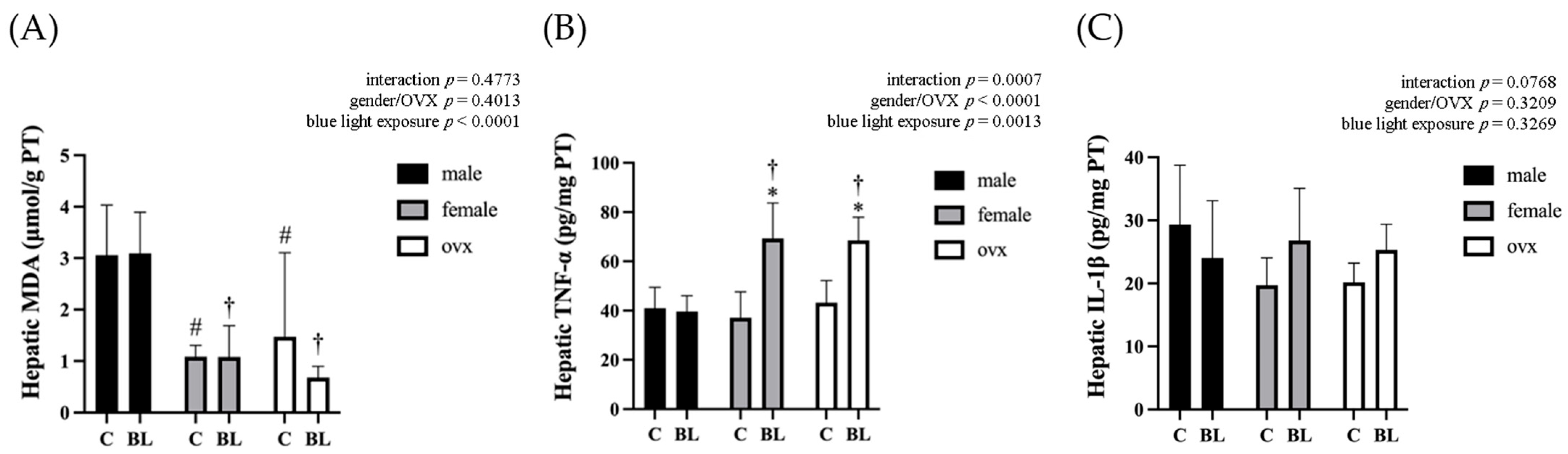 10]. However, current research on the relationship between blue light exposure and diet-induced NAFLD is still quite limited. Therefore, this study aims to clarify the potential effects of long-term exposure to blue light on hepatic injury. Firstly, we investigated whether exposure to blue light alone would affect liver health in mice of different genders and ovariectomy (OVX) status. Secondly, we further evaluate the effects of blue light exposure on hepatic lipid accumulation, oxidative stress, inflammatory responses, and gut microbiota in mice consuming an unhealthy, high-fat, high-fructose diet.