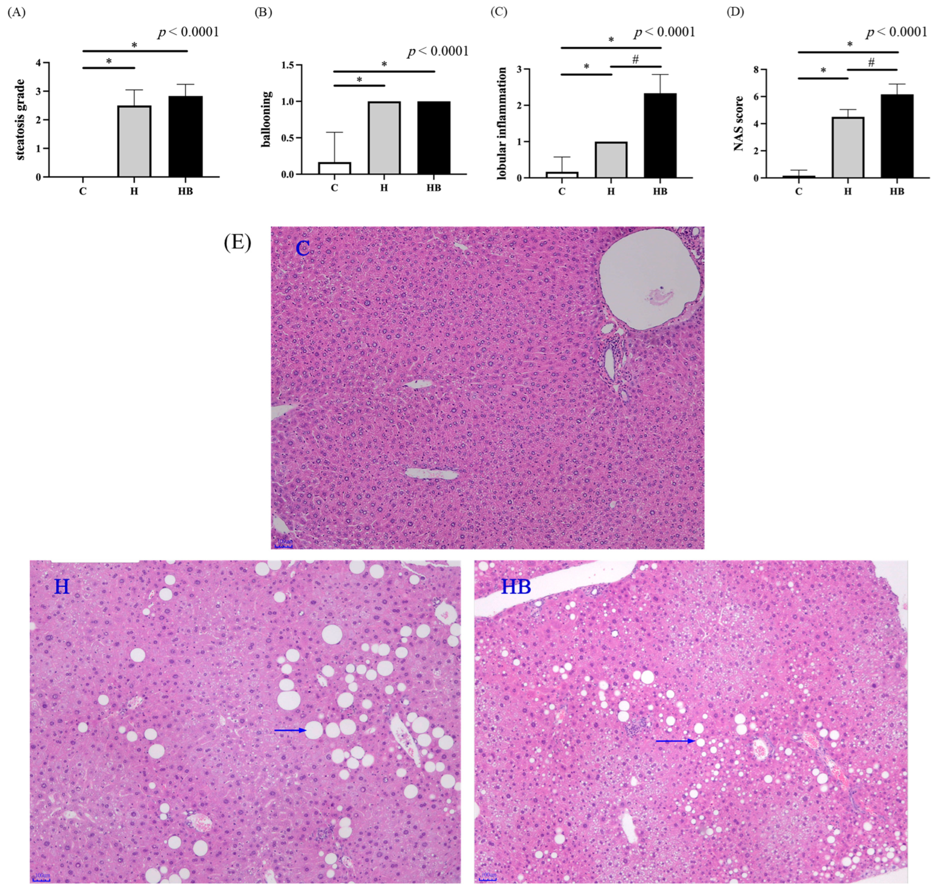 v]) and then stained with hematoxylin and eosin. Tissue morphological changes were examined by a pathologist, and fat accumulation and damage were scored according to Brunt’s method [