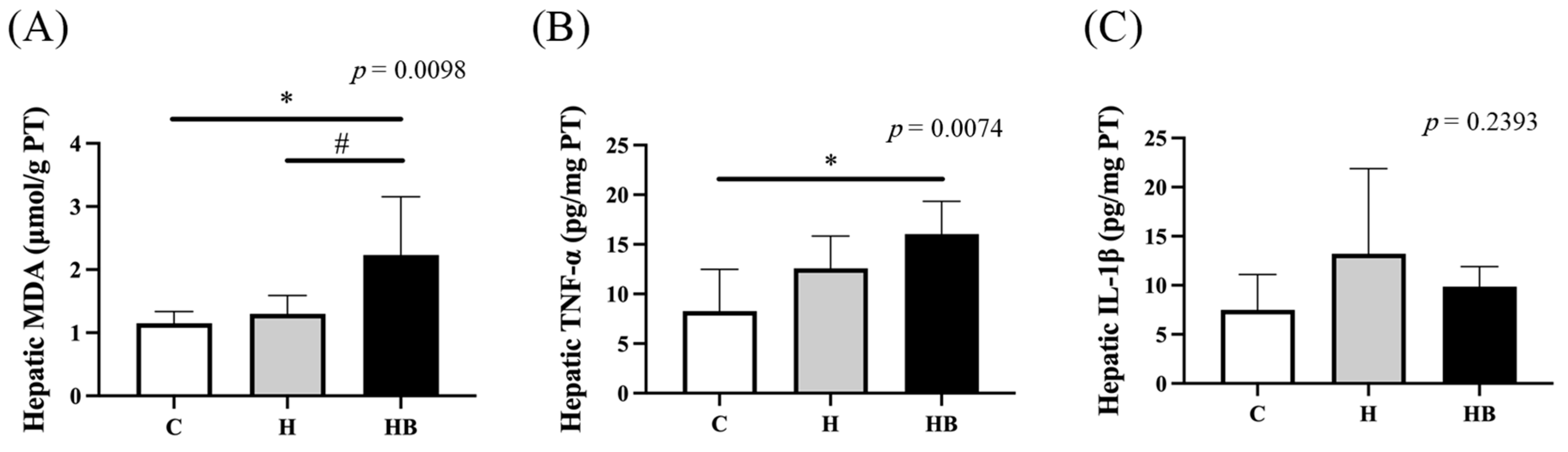 Experiment 2: Eighteen 6-week-old male ICR mice were purchased from BioLASCO Taiwan Co., Ltd. (Yilan, Taiwan). All study protocols were reviewed and approved by the Institutional Animal Care and Use Committee of the National Taiwan Normal University (No. 112027). The environmental conditions for the mice were maintained in a room at 22 °C, 55% humidity, and a 12 h light/dark cycle. The mice were fed a standard rodent chow diet (Rodent Laboratory Chow 5001, Purina Mills) for 1 week and then switched to a control liquid diet based on AIN93M for an additional 1 week to facilitate adaptation. Then, during the 16-week experimental period, the H and HB groups of mice were fed a high-fat, high-fructose (HFHF) diet [