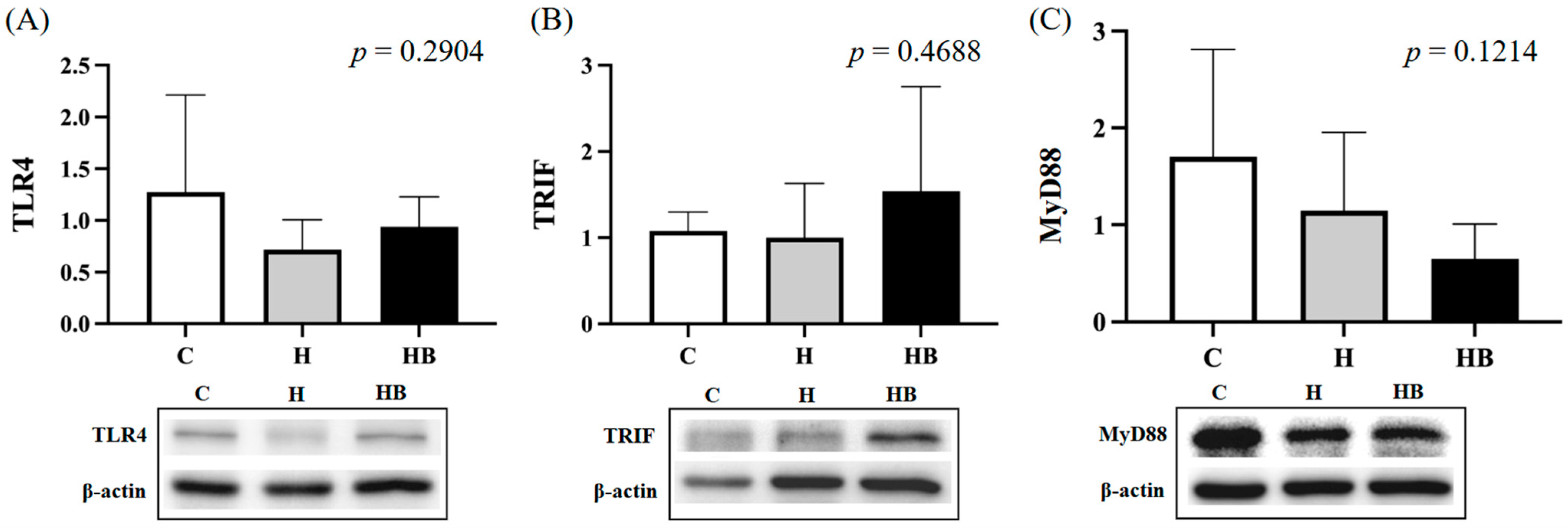 Western blotting was utilized to analyze the expression of proteins involved in the hepatic TLR4 pathway. Samples were initially prepared by homogenizing them in a lysis buffer (50 mM Tris-HCl, 50 mM NaCl, 1% NP-40, 0.1% SDS) supplemented with protease inhibitors. Following centrifugation, 30 μg of supernatant protein was loaded onto an 8% gel made with SDS-polyacrylamide (1610158, Bio-Rad Laboratories) for separation, after which the proteins were transferred to a polyvinylidene difluoride (PVDF) membrane. The membrane was initially blocked by incubation in non-fat milk to prevent the non-specific binding of antibodies. After washing with PBS/Tween-20, the membrane was combined with an anti-Toll-like receptor 4 (TLR4) antibody (monoclonal antibody to TLR4, IMG-5031A, Novus Biologicals, Centennial, CO, USA), anti-myeloid differentiation primary response 88 (MyD88) antibody (MyD88, D80F5 rabbit mAb, Cell Signaling Technology), and anti-TIR-domain-containing adapter-inducing interferon-β (TRIF) antibody (TRIF/TICAMI antibody, N8120-13810, Novus Biologicals) and secondary antibodies (horseradish peroxidase [HRP] donkey anti-rabbit immunoglobulin G [IgG] antibody 406401; HRP goat anti-mouse IgG antibody 405306, Biolegend, San Diego, CA, USA). After washing, the membranes were treated using a chemiluminescence detection system (PerkinElmer, Waltham, MA, USA) to visualize the immune complexes. The resulting bands were then quantified using the BioSpectrum AC image system, UVP Visionwork LS software, and Image-Pro Plus 4.5 (Media Cybernetic, Rockville, MD, USA). β-actin (Proteintech, 20536-1-AP, IL, USA) served as the total protein loading control. Data are ultimately reported as the relative proportion of the protein compared to the control protein.