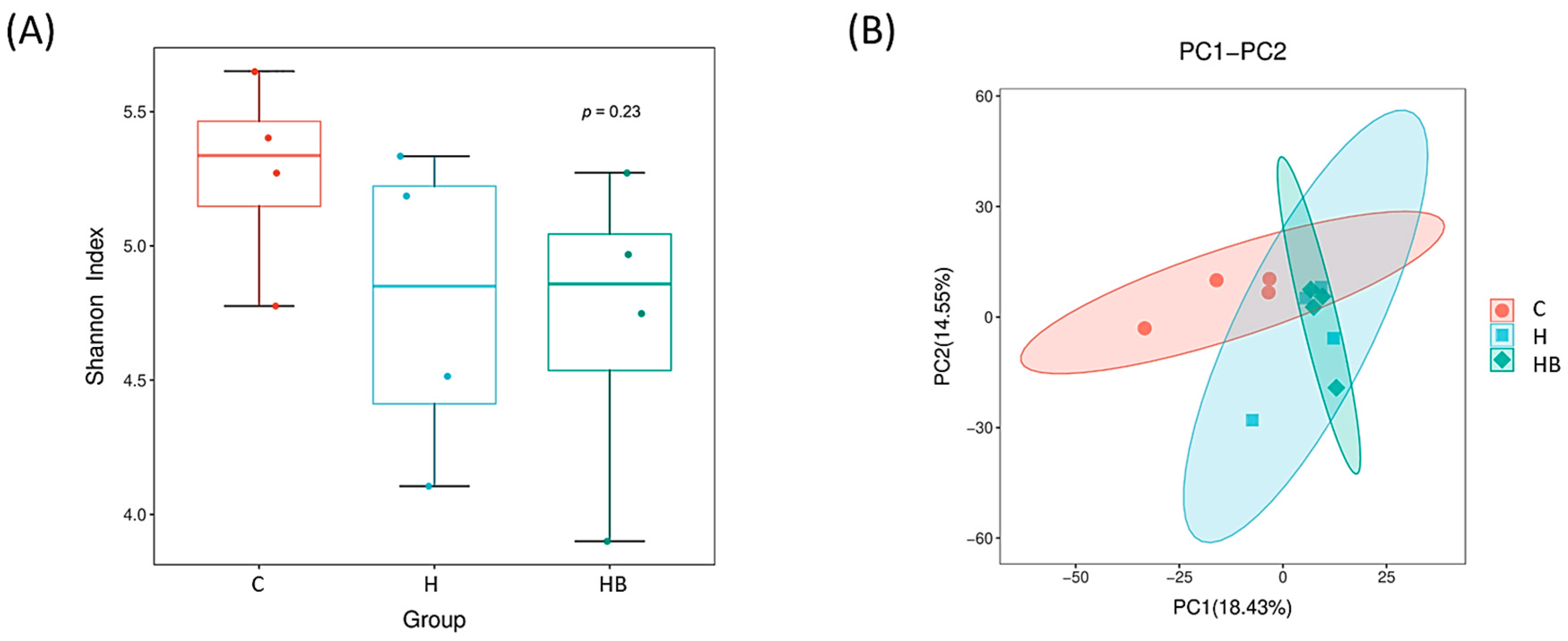 17]. The Shannon index was implemented to measure alpha diversity, whereas beta diversity was visualized through PCA based on OTU abundance. Taxonomical profiling was conducted at the phylum, class, family, and genus levels to assess relative abundance distributions.
