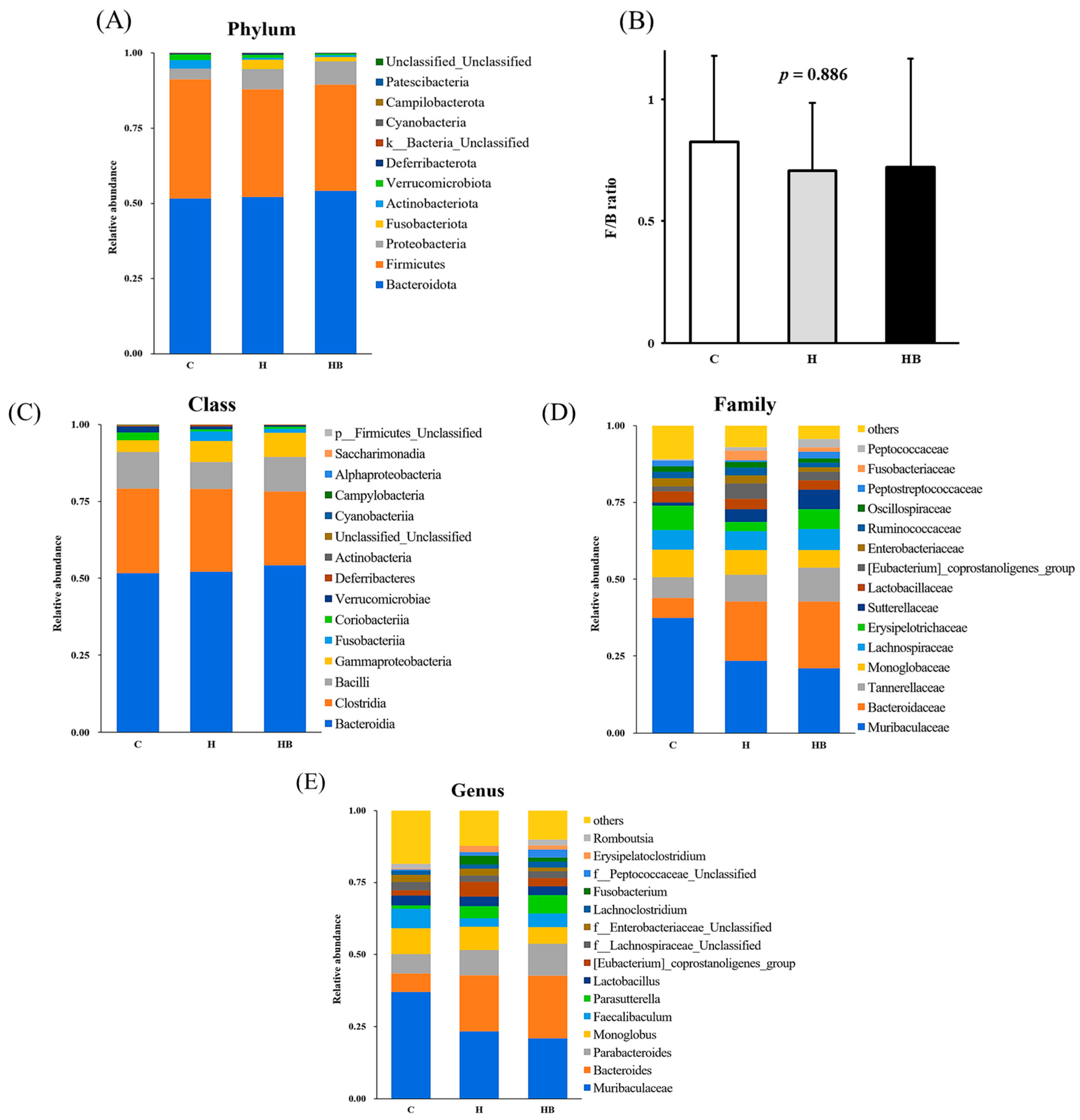 31]. In this study, we found that the relative abundance of Bacteroides was increased in both the H and the HB groups, suggesting that Bacteroides may exhibit a compensatory growth advantage under an HFHF diet; however, the functional differences at the species level still require further clarification. Most Corynebacteria are commonly found on the skin, but they have also been detected in gut samples recently, and some strains are believed to be involved in lipid metabolism and cholesterol conversion [