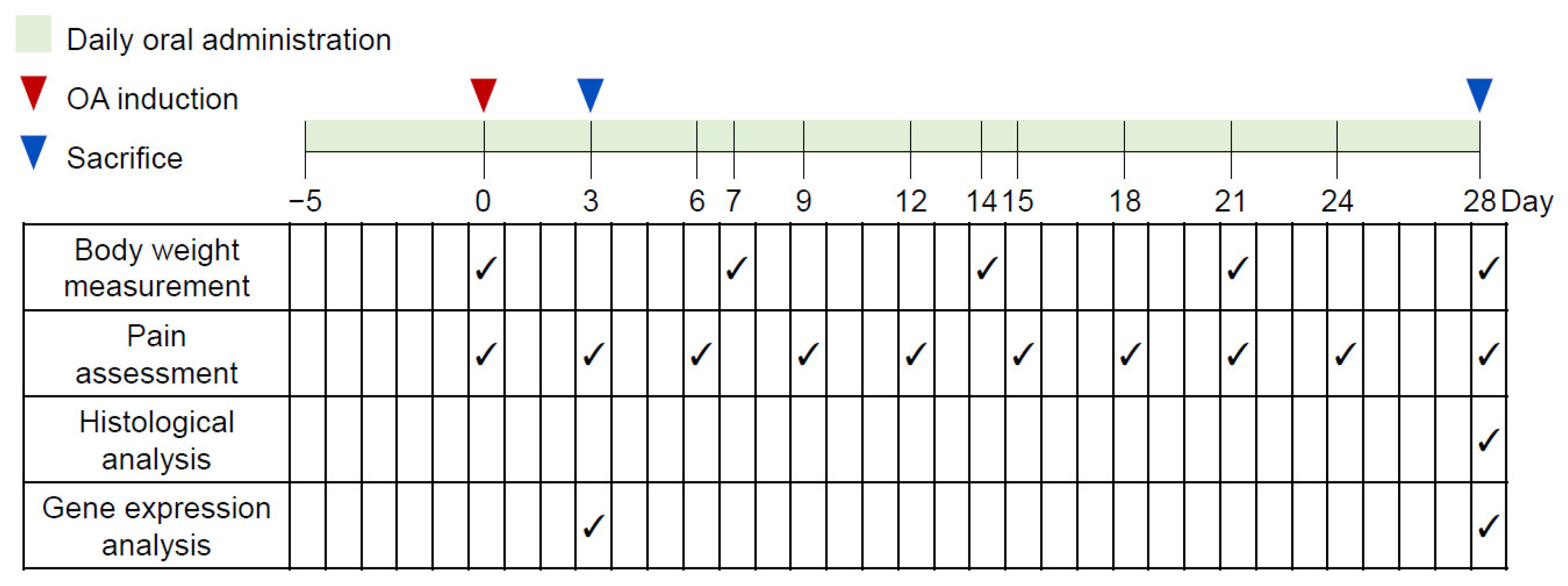 The experimental subjects were subsequently divided into three independent cohorts corresponding to distinct analytical endpoints: (1) functional assessment (pain), histology, and immunohistochemistry; (2) mRNA expression analysis for early-stage OA (Day 3); and (3) mRNA expression analysis for the late-stage OA (Day 28). Each of these cohorts was structured into five distinct experimental groups (